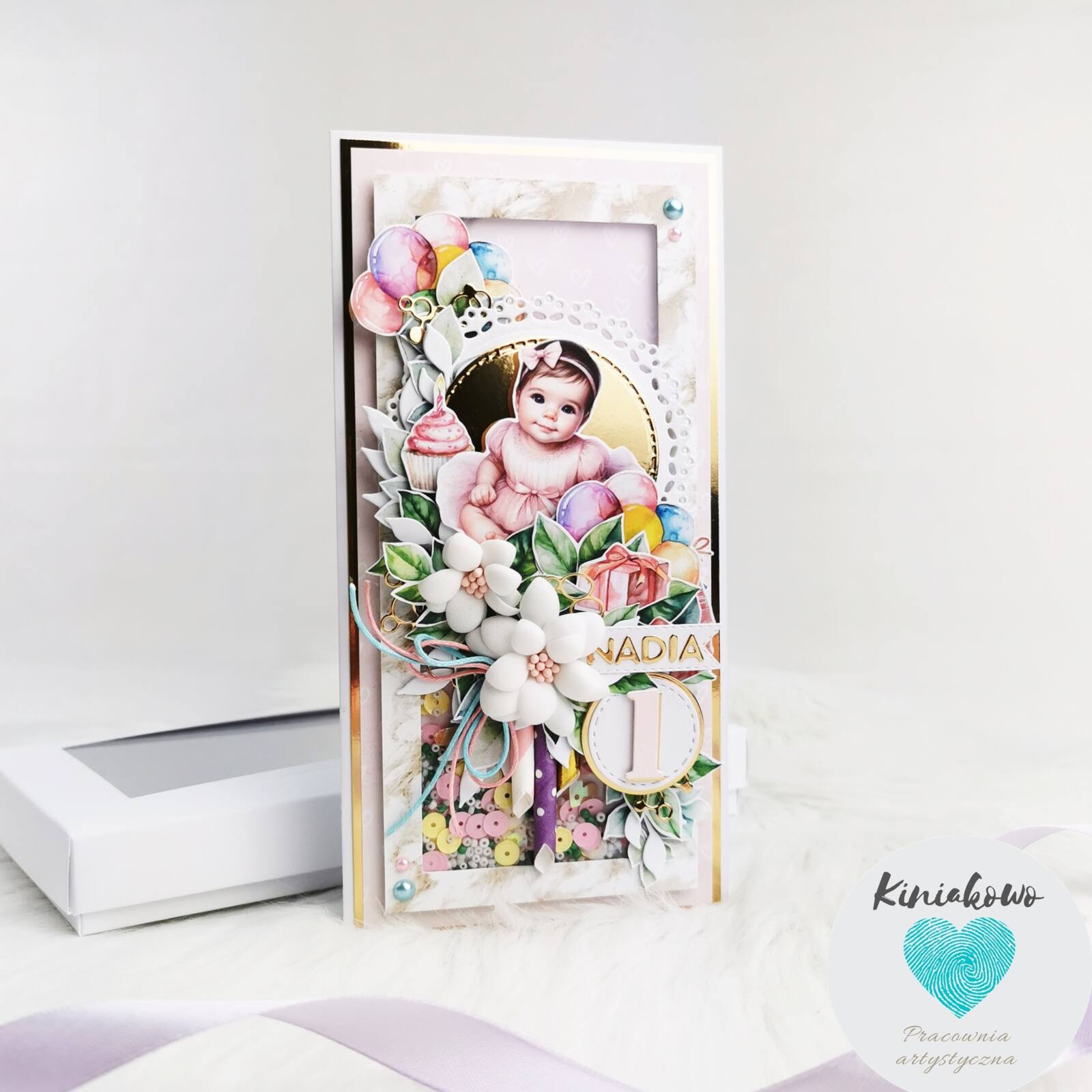 80,00 złPersonalizowana kartka z sercem i cekinami. Kartka w biało-różowej kolorystyce. Elegancji dodają złote wstawki.