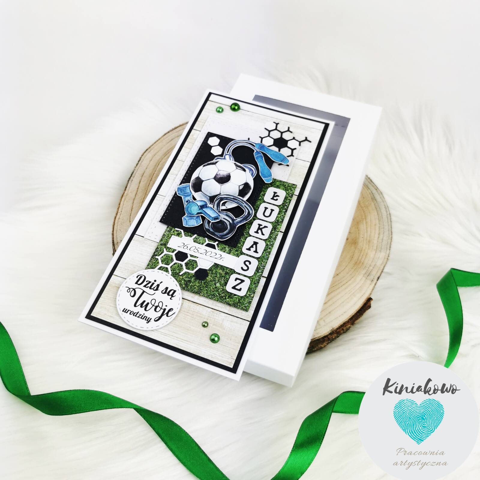 Kartka dla fana piłki nożnej to kartka typowo męska. Została stworzona na zielonym tle murawy, łączonym deskami. W centralnej części została umieszone akcesoria piłkarskie oraz sportowe. Kartka umieszona w pudełku z okienkiem oraz przewiązana wstążką. Wymiary kartki to 10,5x21cm.