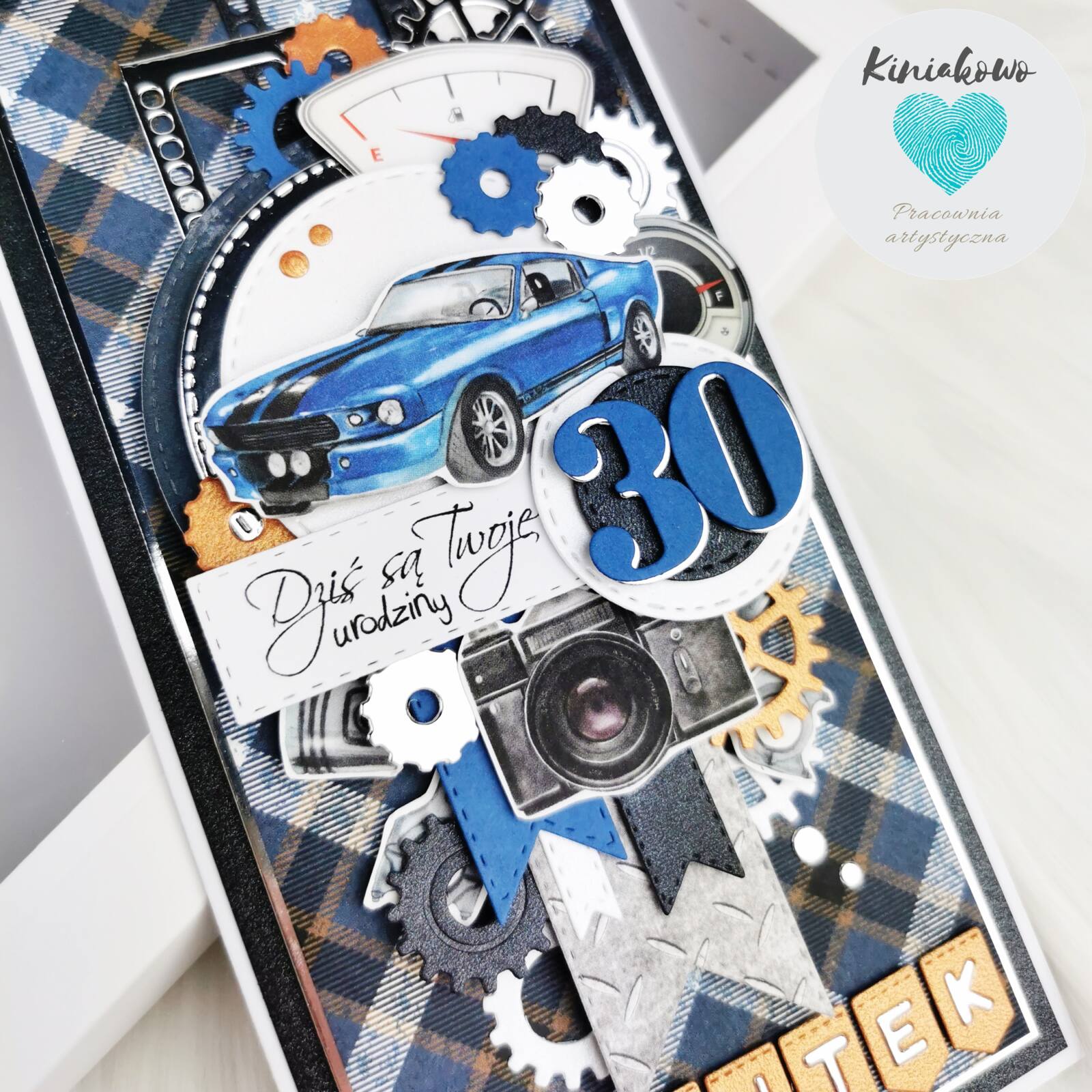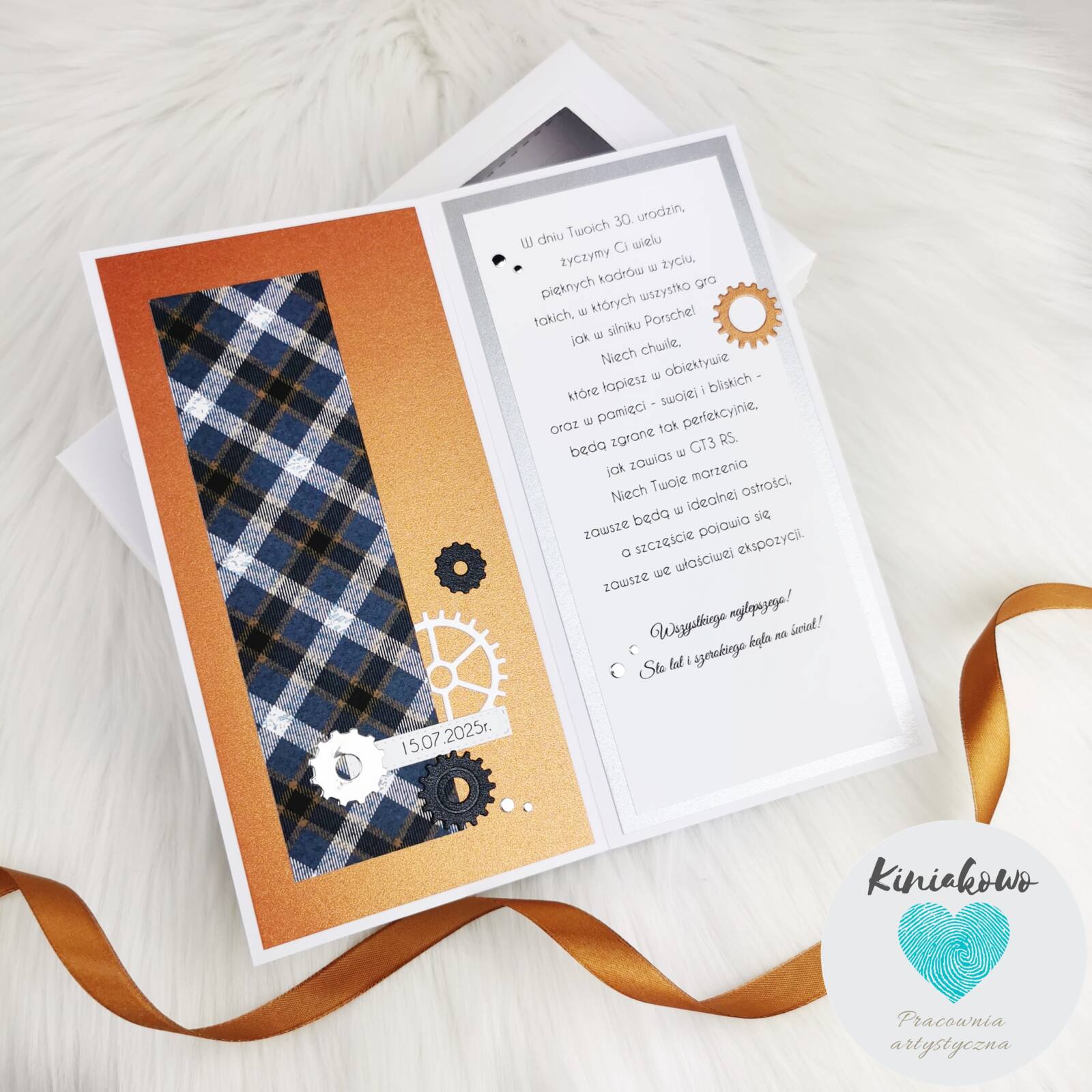 Podaruj wyjątkowy prezent w formie kartki, która zachwyci już od pierwszego spojrzenia. Ta ręcznie robiona kartka dla mężczyzny to połączenie elegancji, nowoczesności i pasji. Inspirowana światem motoryzacji i fotografii, przedstawia sportowy samochód oraz aparat fotograficzny w wyjątkowej, artystycznej kompozycji. Utrzymana w głębokiej, męskiej kolorystyce – granatach i czerniach – została ozdobiona lustrzanym srebrem, które nadaje jej odrobinę luksusu i przyciąga wzrok. Kartka dla mężczyzny motoryzacyjny obiektyw jest umieszona w białym eleganckim pudełku z okienkiem i przewiązana satynową wstążeczką. Wymiary kartki to 10,5x21cm.