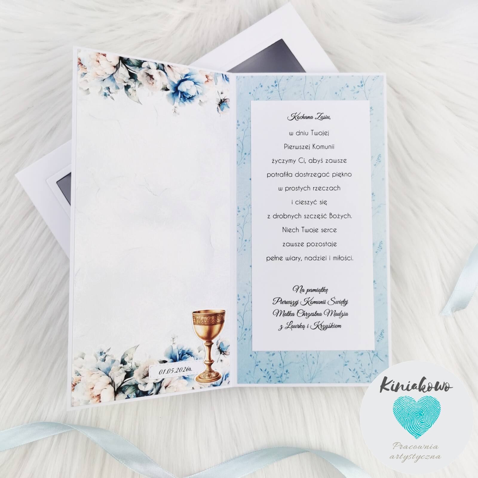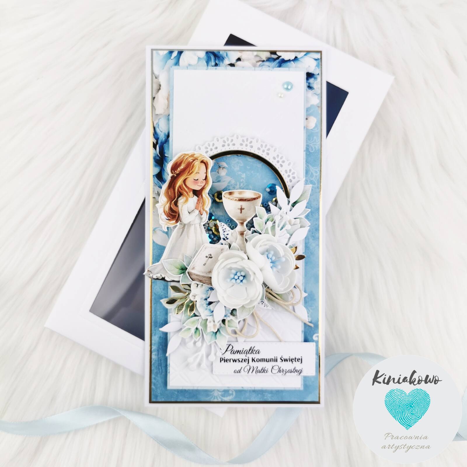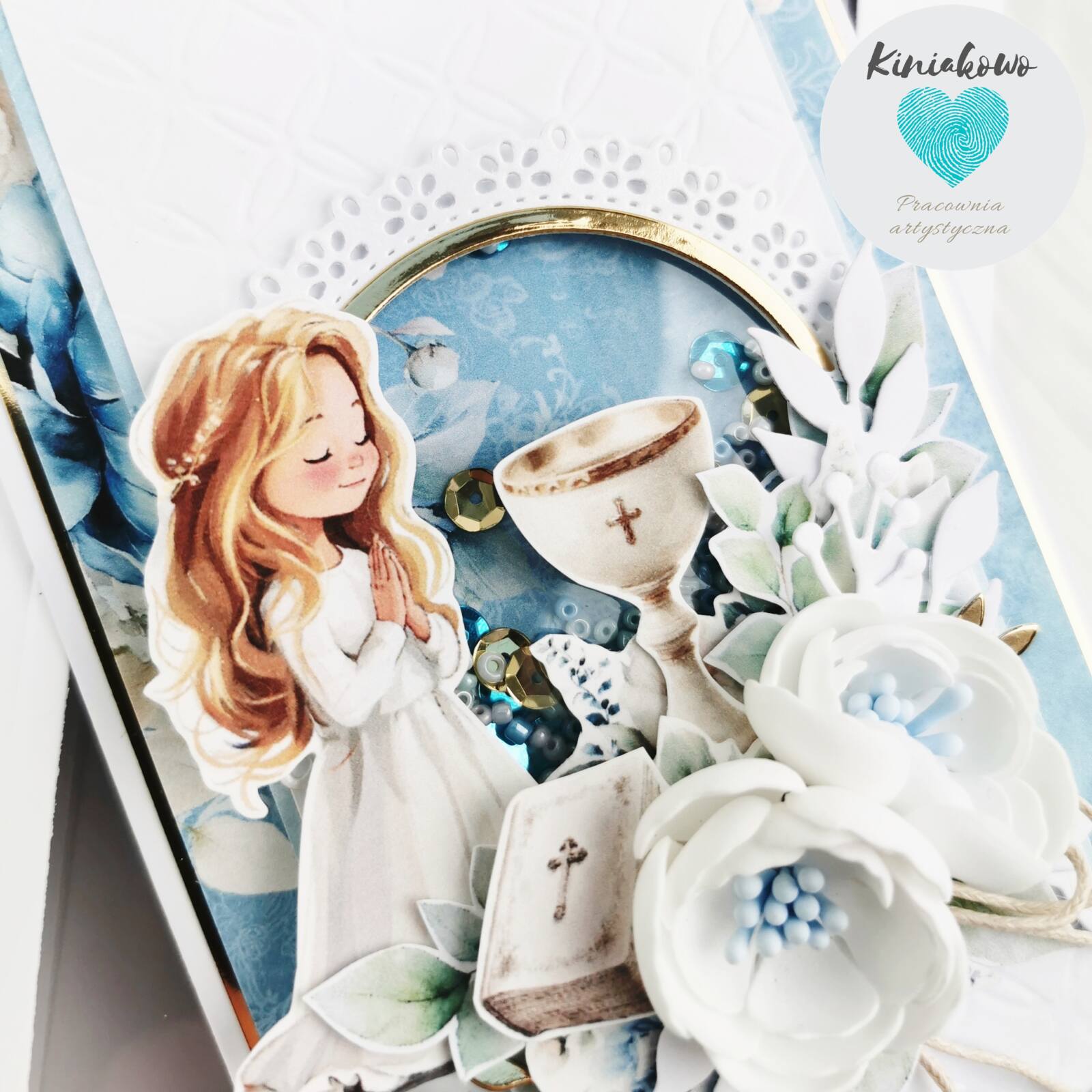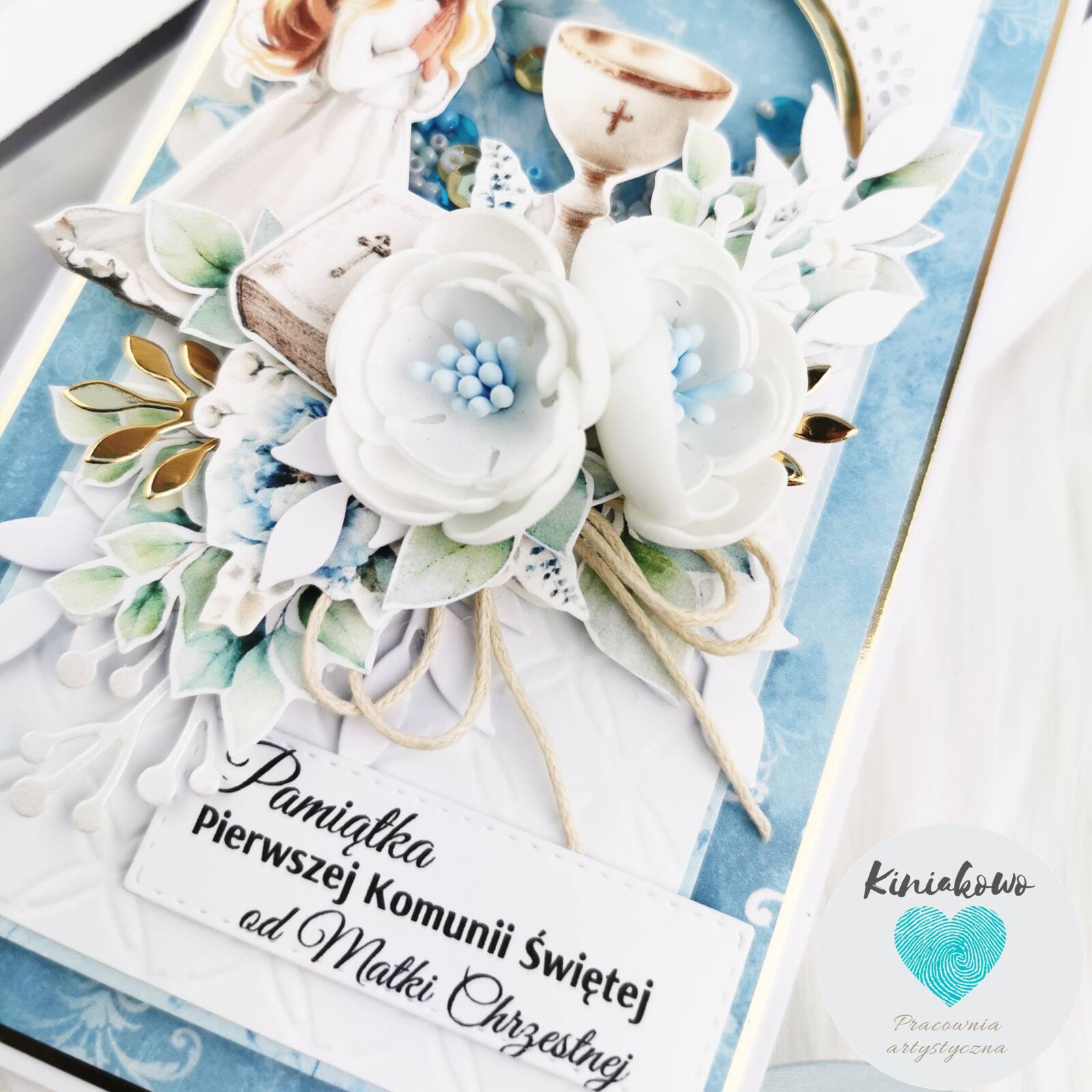 Wyjątkowa, ręcznie wykonana kartka komunijna niebiańska pamiątka to bardzo elegancka i pełna uroku pamiątka Pierwszej Komunii Świętej dla dziewczynki. Stworzona z najwyższą starannością, zachwyca subtelną kompozycją w biało-niebieskiej kolorystyce, która symbolizuje czystość, niewinność i duchowy charakter tego szczególnego dnia. Centralnym elementem kartki jest modląca się blond dziewczynka, która pięknie podkreśla dziecięcą delikatność oraz religijny wymiar uroczystości. Wokół niej znajdują się ręcznie robione białe kwiatki z niebieskimi środeczkami, dodające całości lekkości, świeżości i dziewczęcego wdzięku. Starannie dobrane dekoracje tworzą harmonijną, przestrzenną kompozycję handmade. Wymiary kartki to 10,5x21cm. Przestrzenna kartka z imieniem i ręcznie robionymi białymi kwiatuszkami jest doskonałym pomysłem na prezent jako wyjątkowa pamiątka Pierwszej Komunii Świętej. Kartka komunijna niebiańska pamiątka jest pakowana w białe pudełko z okienkiem i przewiązana wstążką.