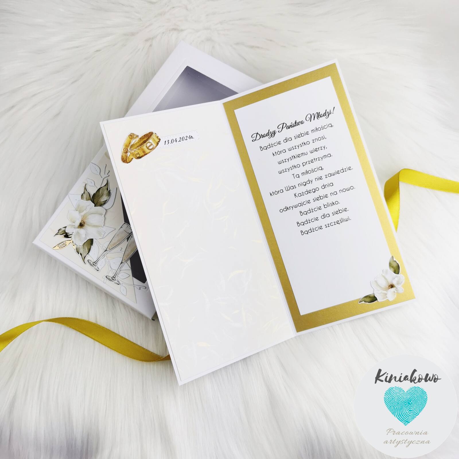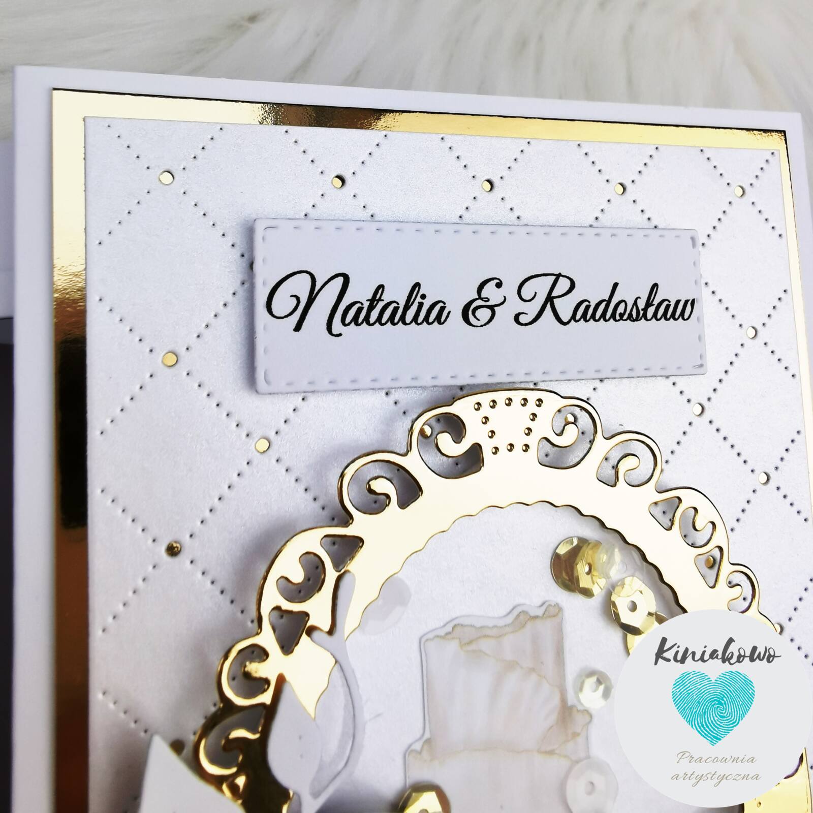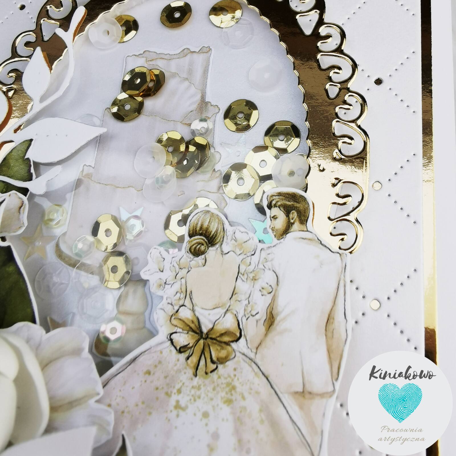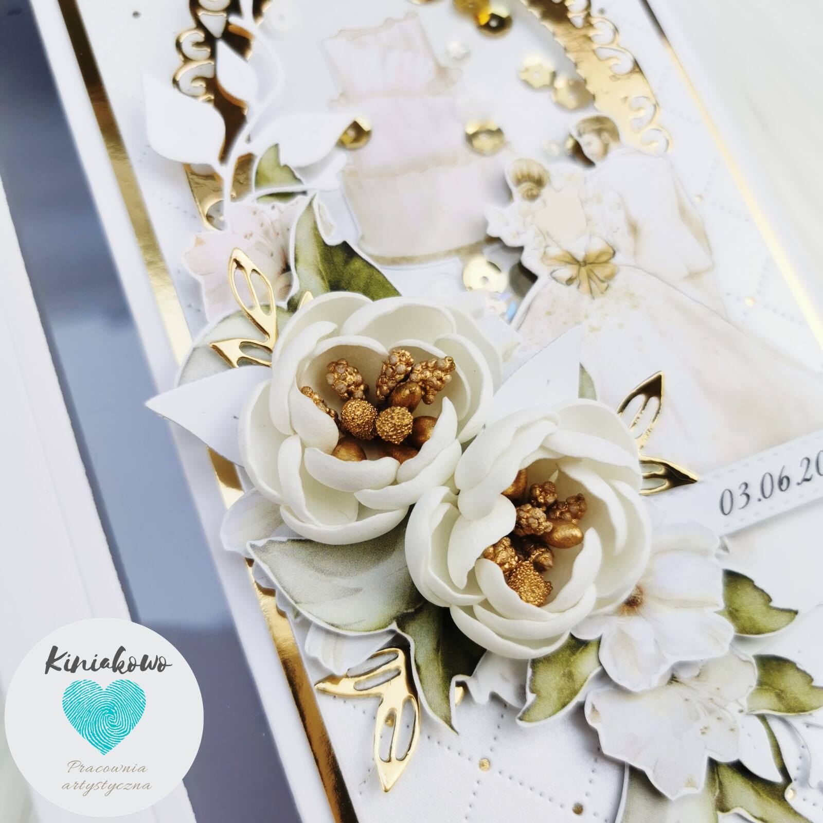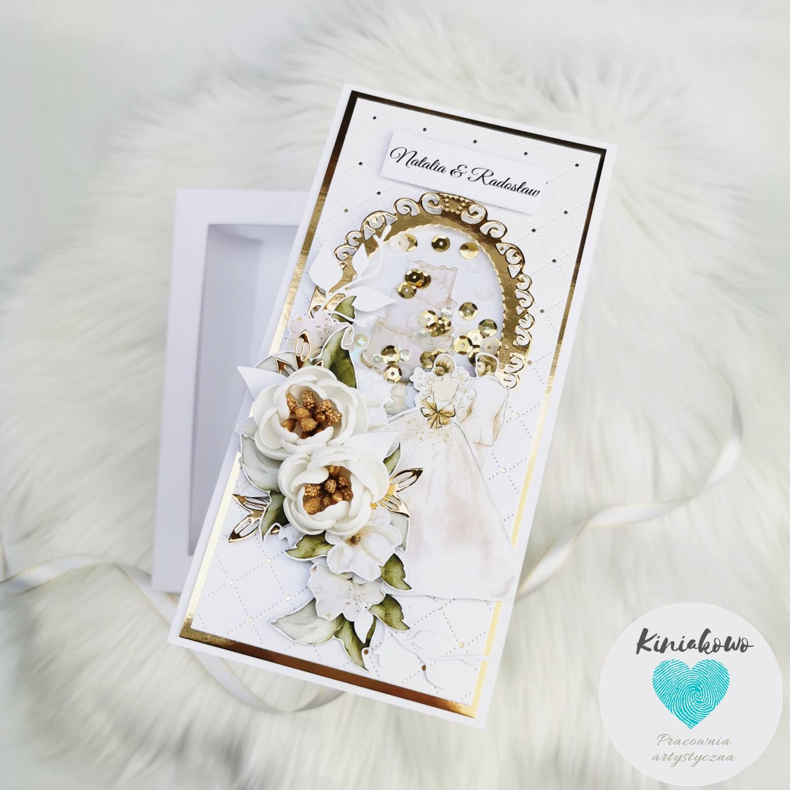 Personalizowana, bardzo elegancka kartka ślubna skąpana w bieli i złocie jest doskonałym pomysłem na upominek na ślub. Została stworzona na pięknym perłowym papierze z tłoczeniami. W środkowej części jest umieszczona klasyczna złota rama z shaker boxem zawierającym drobne cekiny. Otaczają ją Para Młoda, ręcznie robione kwiatki oraz piękne dodatki. Kartka ślubna królewski ślub jest umieszona w białym pudełku z okienkiem i przewiązana wstążeczką. Wymiary kartki to 10,5x21cm.