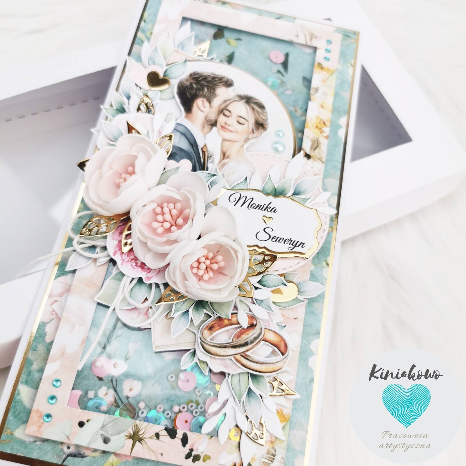 Kartka ślubna turkusowe uczucie to wyjątkowa, ręcznie wykonana kartka, która zachwyci każdą obdarowaną Parę Młodą. W centralnej części znajduje się urocza Para Młoda, otoczona misternie uformowanymi, biało-różowymi kwiatami z delikatnymi listkami. Tło w eleganckim, turkusowym odcieniu nadaje całości świeżości i lekkości, a złote akcenty subtelnie podkreślają wyjątkowy charakter tej pamiątki. Wewnątrz znajduje się miejsce na osobiste życzenia lub możliwość dodania indywidualnego tekstu. Kartka turkusowe uczucie jest umieszona w białym eleganckim pudełku z okienkiem i przewiązana satynową wstążeczką pasująca do całości. Wymiary kartki to 10,5x21cm.
