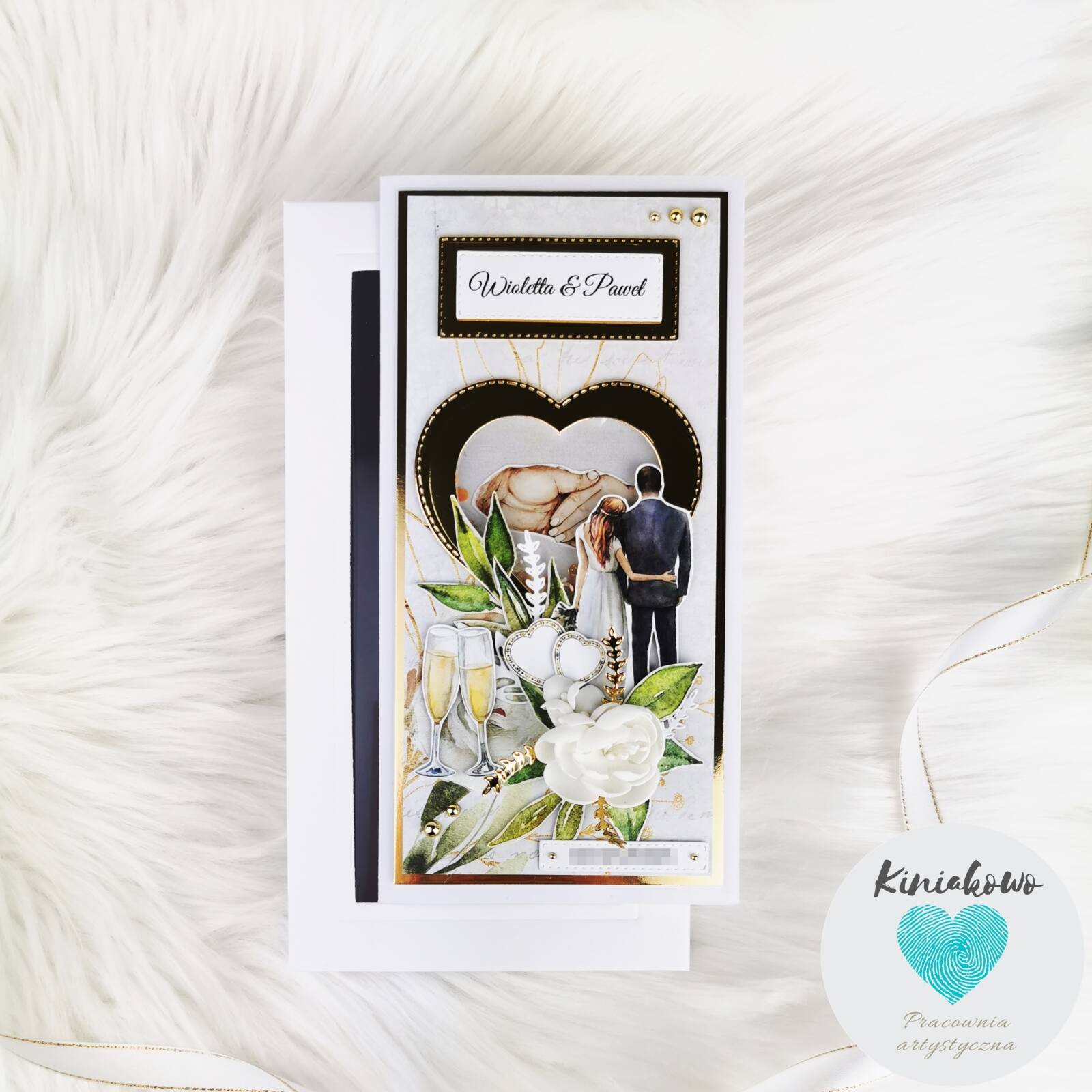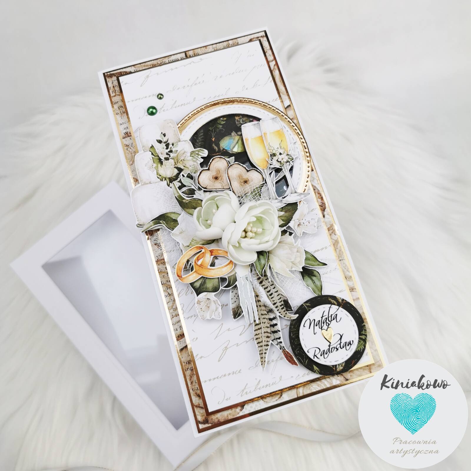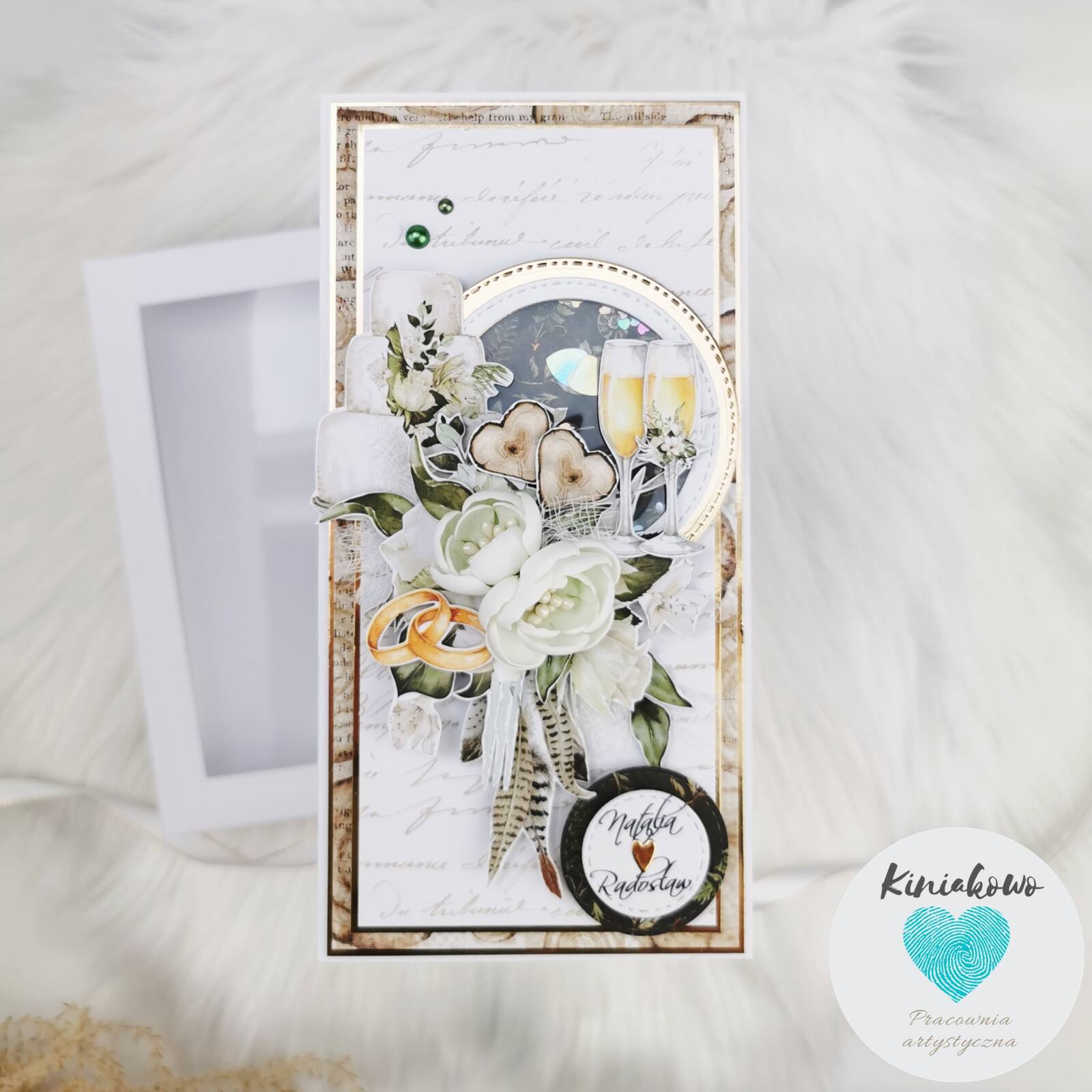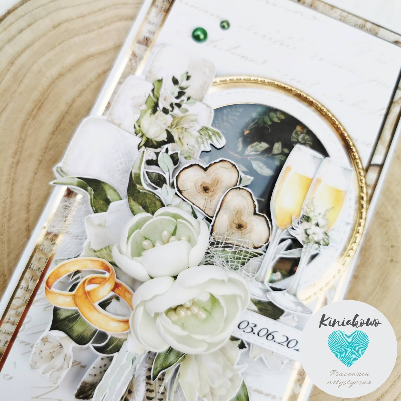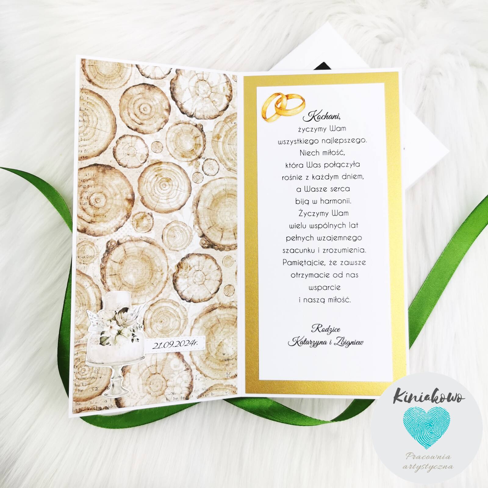 Personalizowana stylowa kartka ślubna z motywem drewna oraz zielonymi i złotymi dodatkami. Została stworzona na papierze w napisy. W środkowej części jest umieszczone koło z shaker boxem zawierającym drobne cekiny. Otaczają je tort, kieliszki z szampanem, ręcznie robione kwiatki oraz piękne dodatki. Kartka ślubna w stylu rustykalnym jest umieszona w białym pudełku z okienkiem i przewiązana wstążeczką. Wymiary kartki rustykalnej to 10,5x21cm.