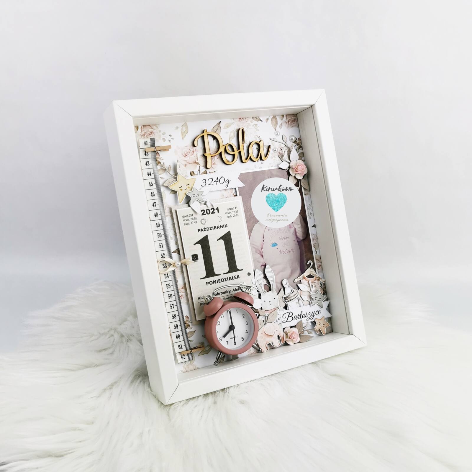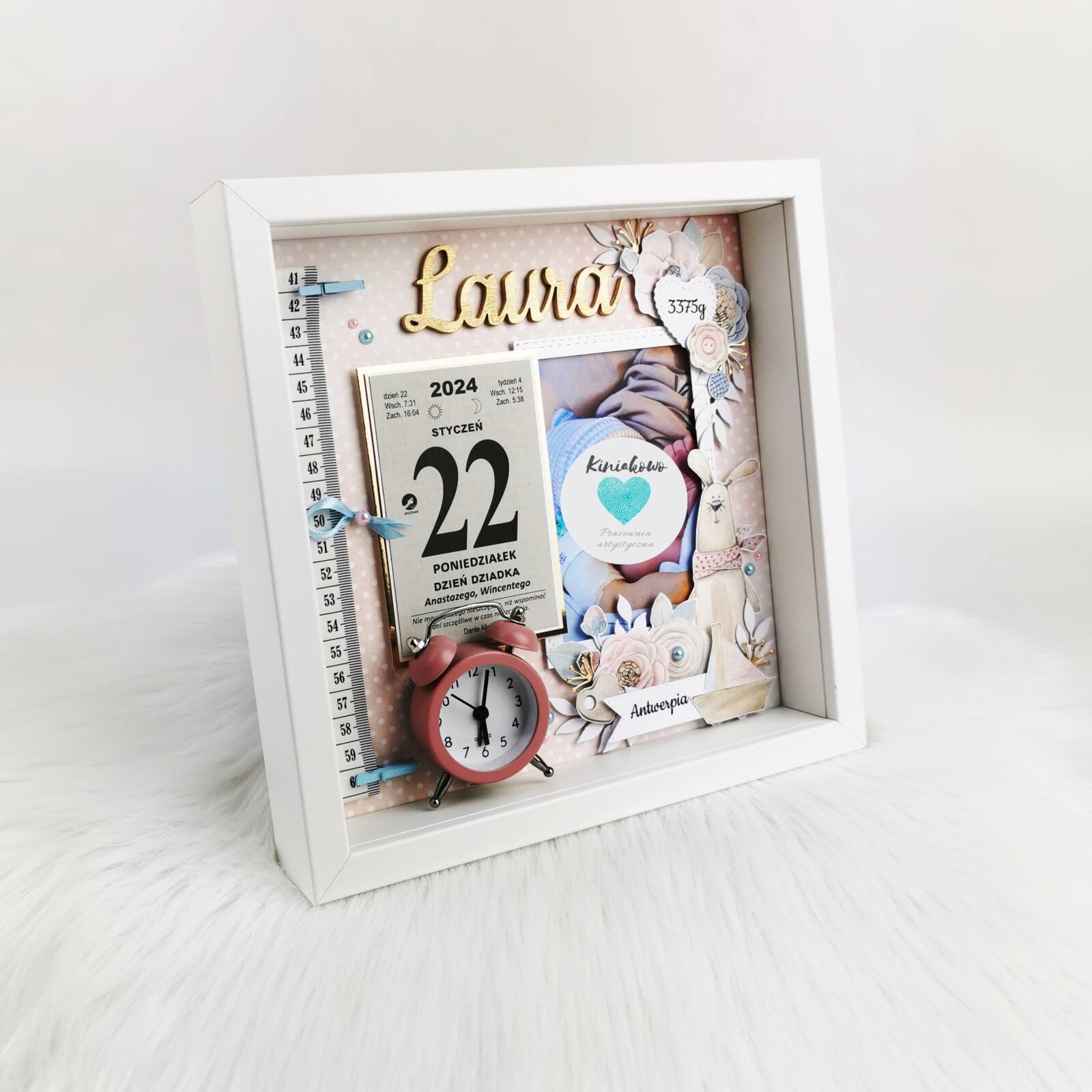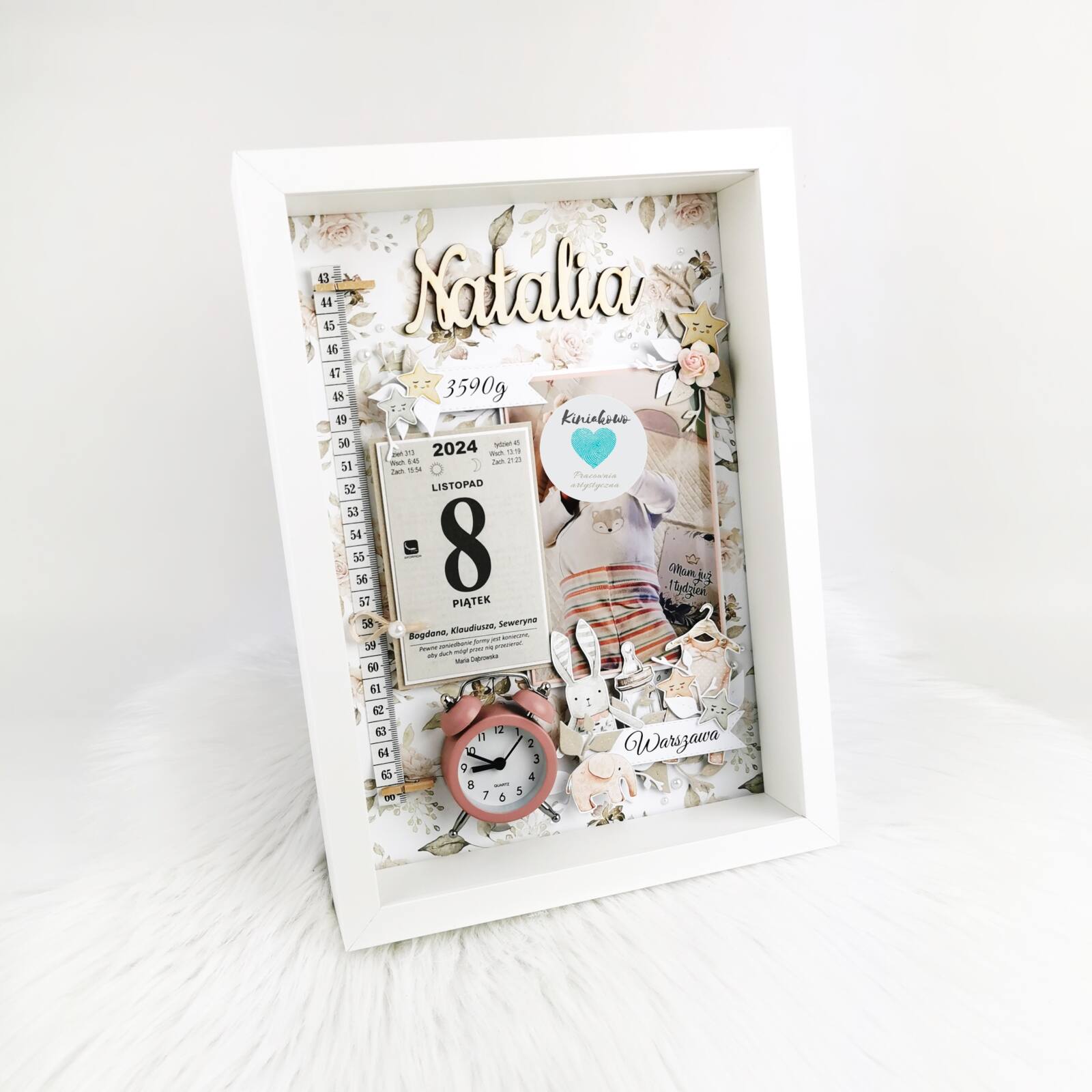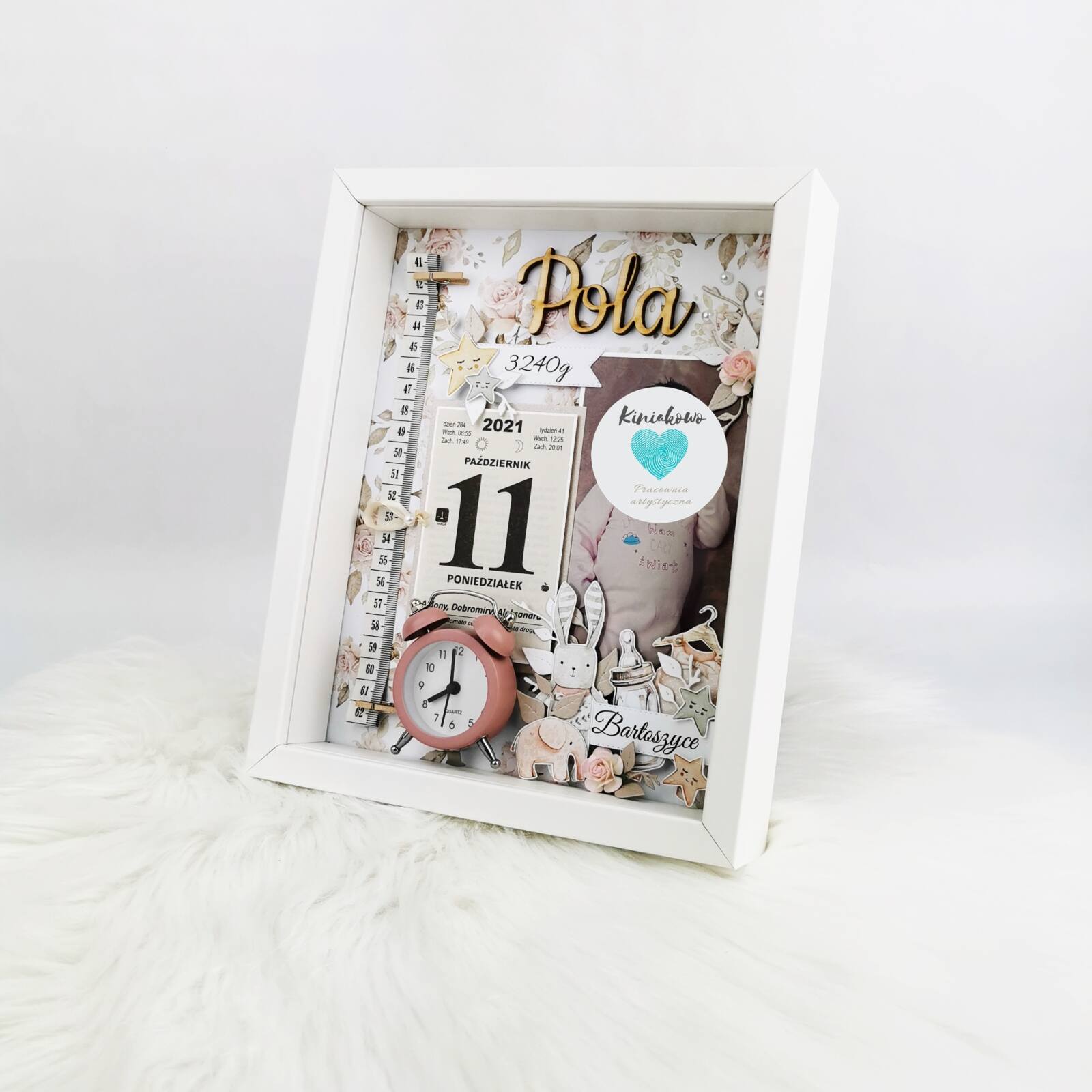 Metryczka kwiatowa jest ramką przestrzenną zawierającą imię dziecka, datę i godzinę urodzenia, wzrost, wagę oraz zdjęcie. Metryczka dla dziewczynki w róże może być wykonana w ramce w kolorze białym bądź dębowym. Do wyboru jest również kilka rozmiarów ramek, tak aby najlepiej dopasować nasz spersonalizowany produkt do oczekiwań Klienta. Przez wzgląd na to, że papier tworzący tło metryczki dla dziecka ma jeden rozmiar, w każdym rozmiarze ramki metryczka z motywem kwiatowym będzie się różnić od tej przedstawionej na zdjęciu głównym. Na zdjęciu głównym jest zaprezentowana metryczka w róże w rozmiarze 20x25cm. Metryczka w róże stworzona w ramce o wymiarach 28x35cm będzie zawierała białe tło w dolnej części.