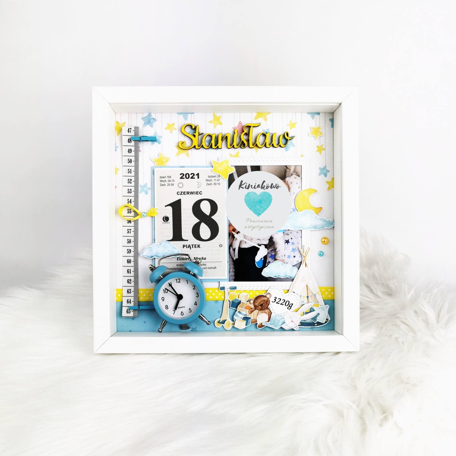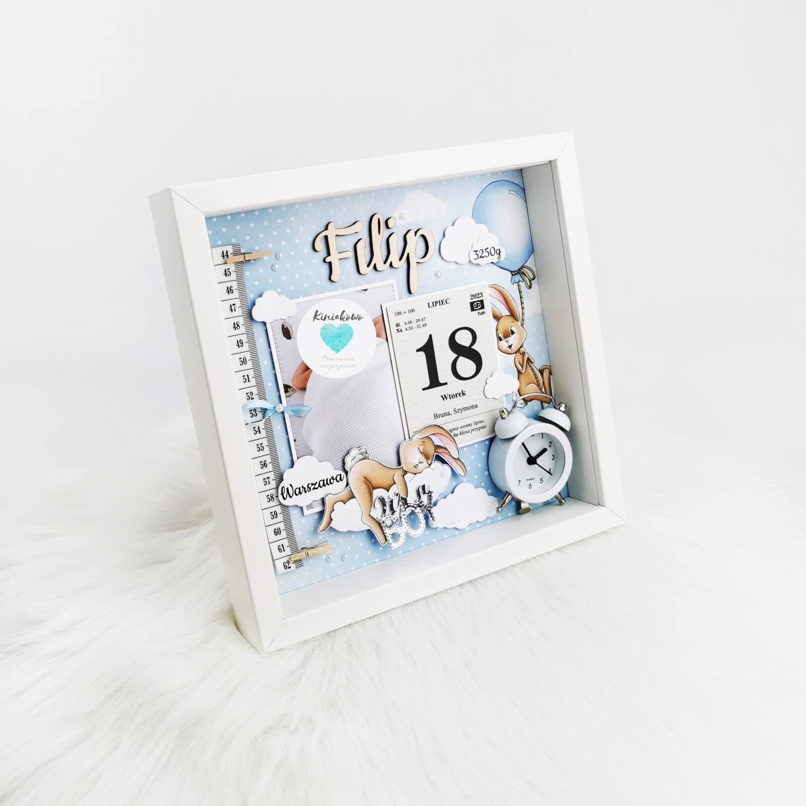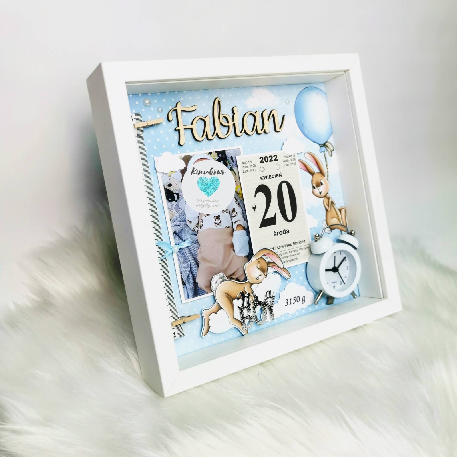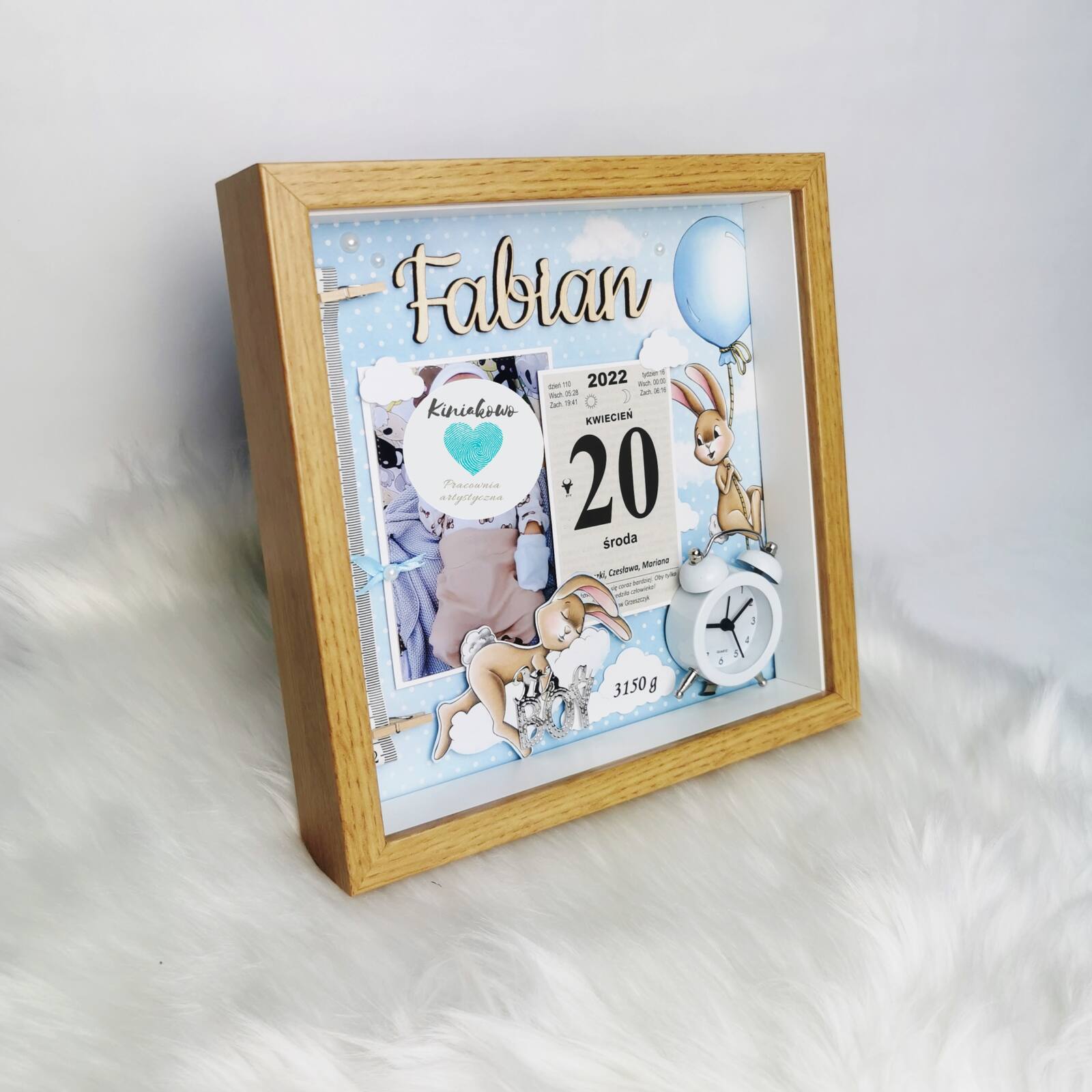 Metryczka dla dziecka jest w 100% ręcznie wykonywanym produktem w naszej pracowni artystycznej. Jest tworzona z niezwykłą precyzją oraz dbałością o najmniejszy detal. Wprawi w zachwyt każdego, komu zostanie wręczona oraz bezcenną pamiątką. Metryczka dziecięca jest doskonałym prezentem dla chłopca. Z kolei dla dziewczynki możemy stworzyć dla Ciebie ramkę dziecięcą w różowej kolorystyce z zajączkiem. Podkreśli znaczenie tak ważnych okoliczności jak narodziny dziecka, chrzciny czy roczek.