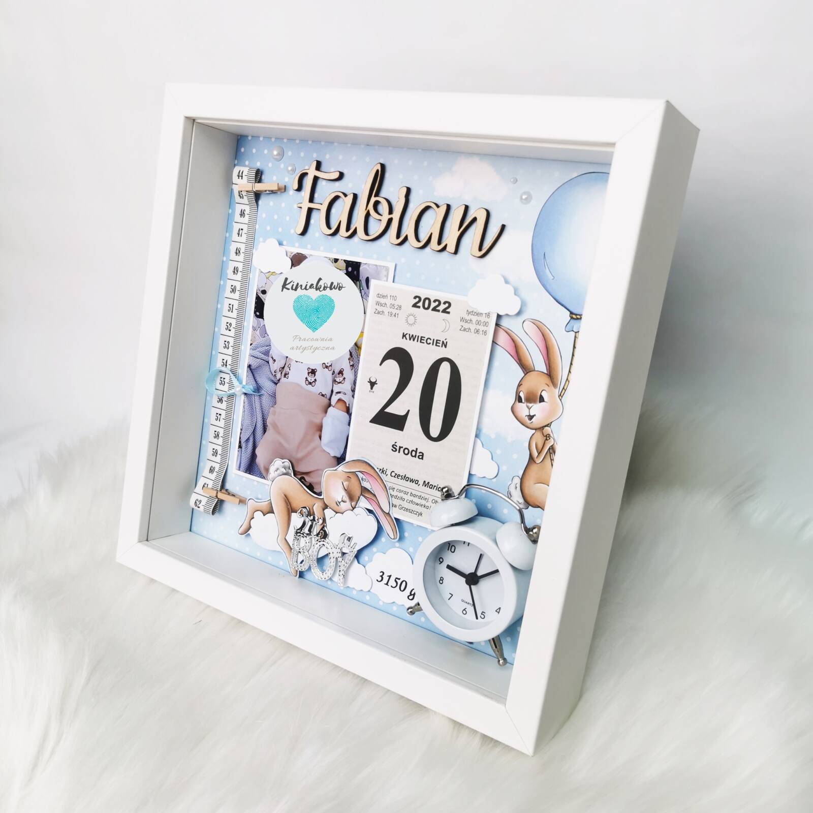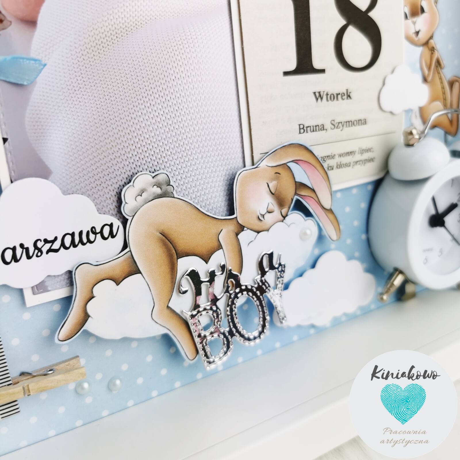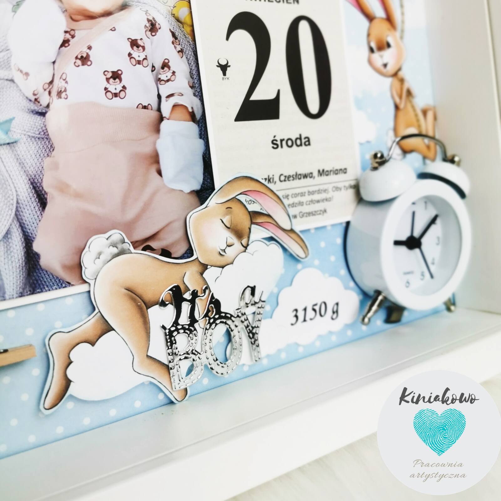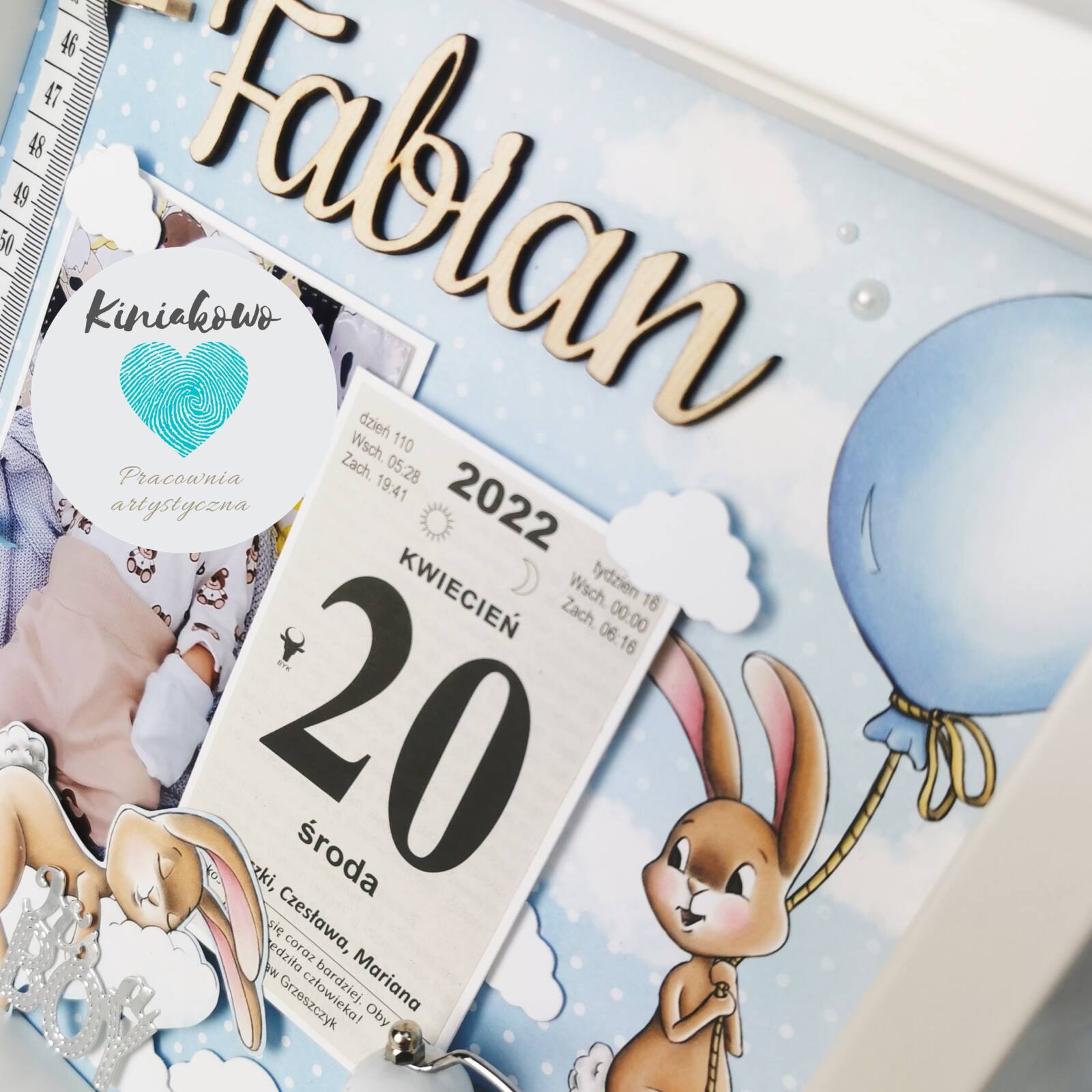Metryczka wesoły zajączek to propozycja uroczej pamiątki dla dziecka. Ramka posiada piękne niebieskie tło w klasyczne białe kropki z motywem ślicznego zajączka. Personalizowana metryczka z motywem zajączków dla dziecka doskonale uzupełni wnętrze każdego pokoju dziecięcego. Ręcznie wykonana metryczka dziecięca zawiera zdjęcie Maluszka, jego imię w kolorze naturalnego drewna, wagę urodzeniową zamieszczoną na chmurce, mini zegarek w kolorze białym z godziną urodzenia, oryginalną kartkę z kalendarza z datą urodzenia, a także białą miarkę krawiecką z oznaczonym wzrostem.