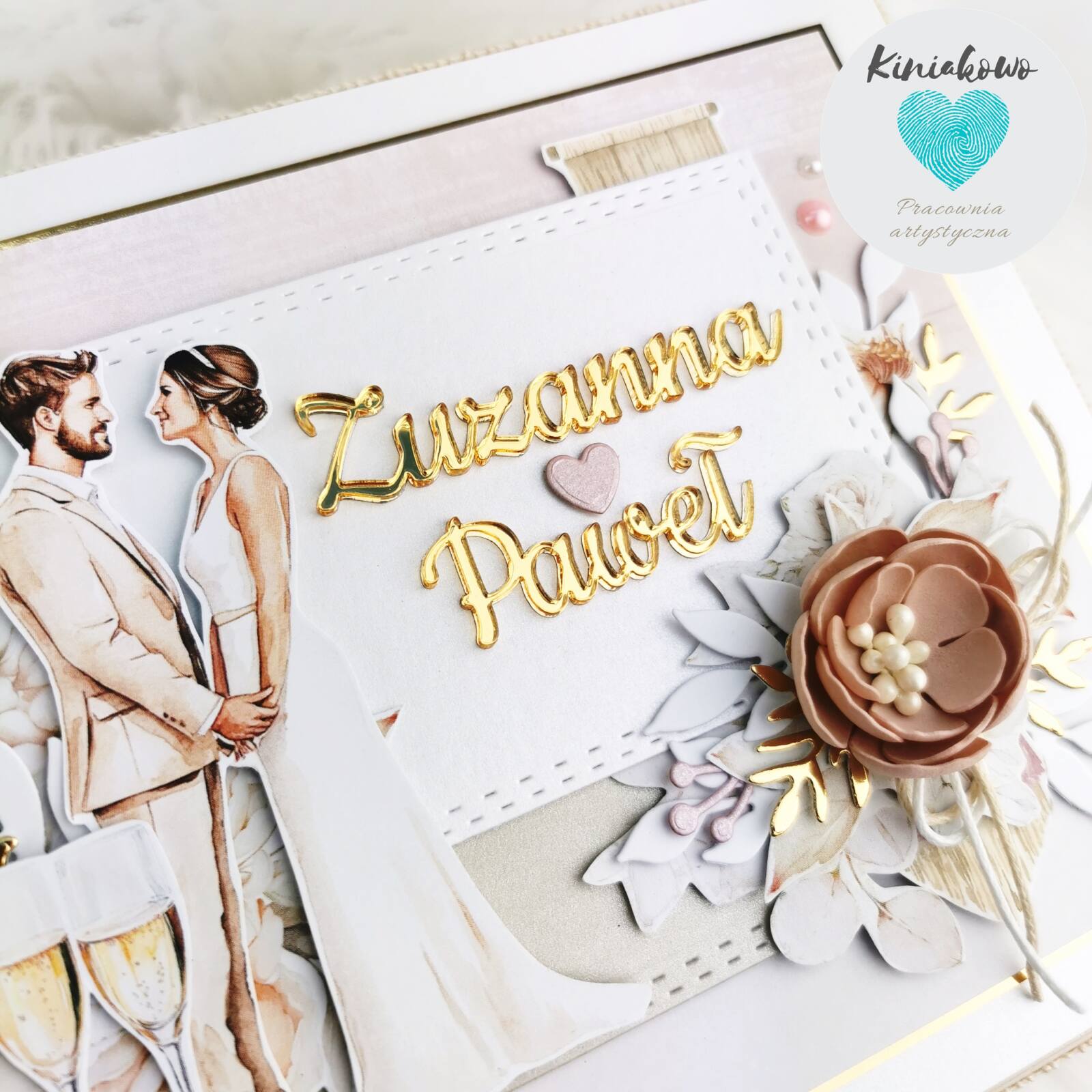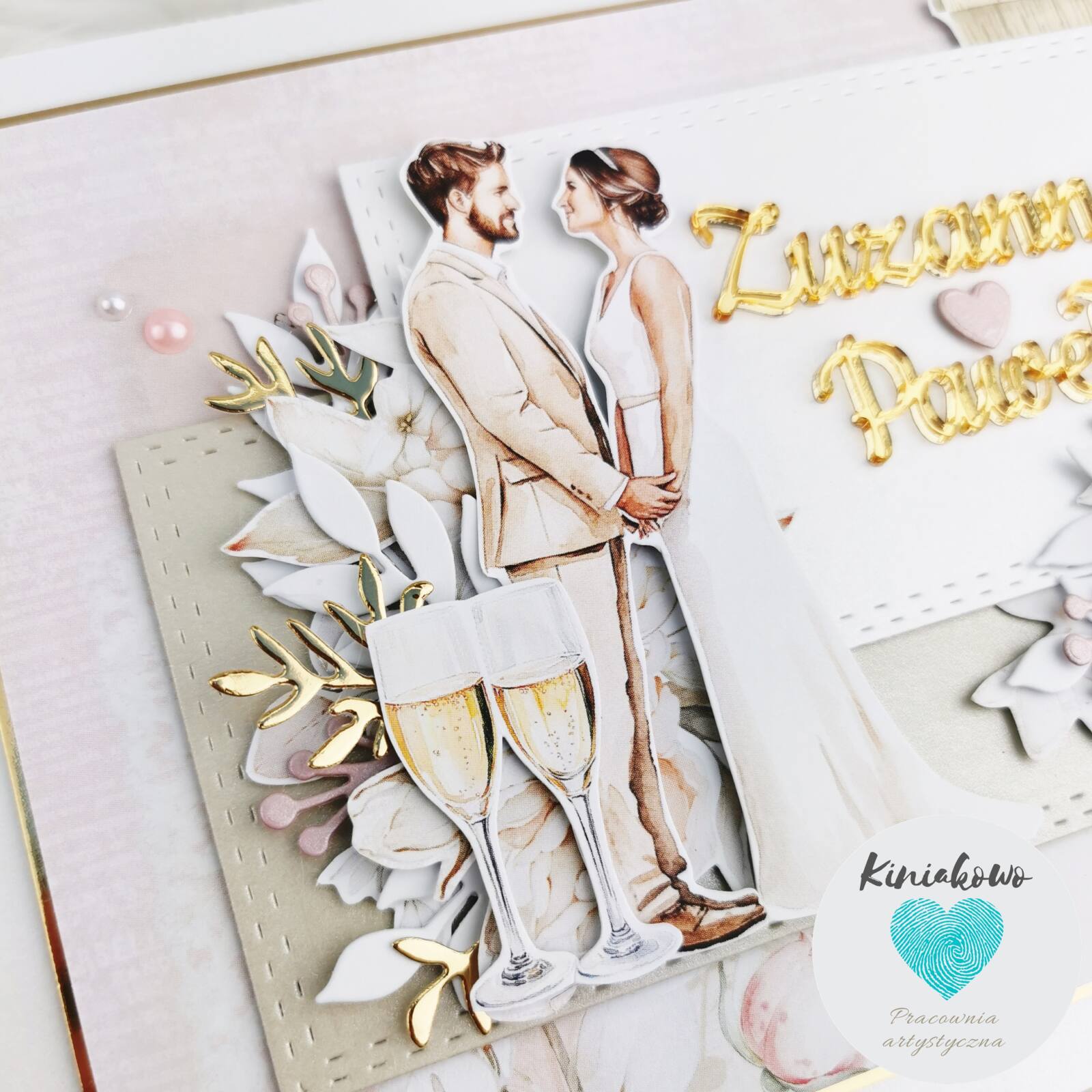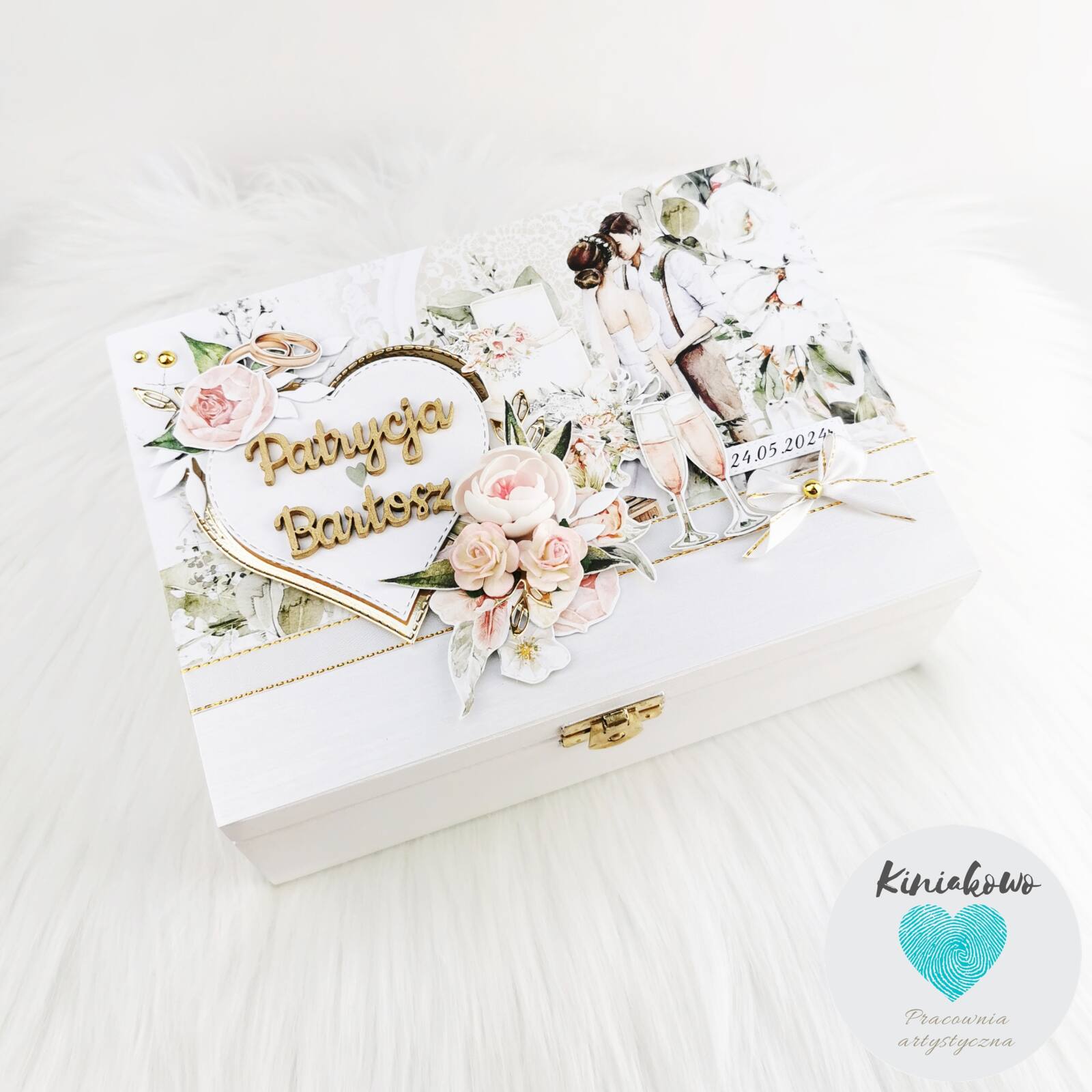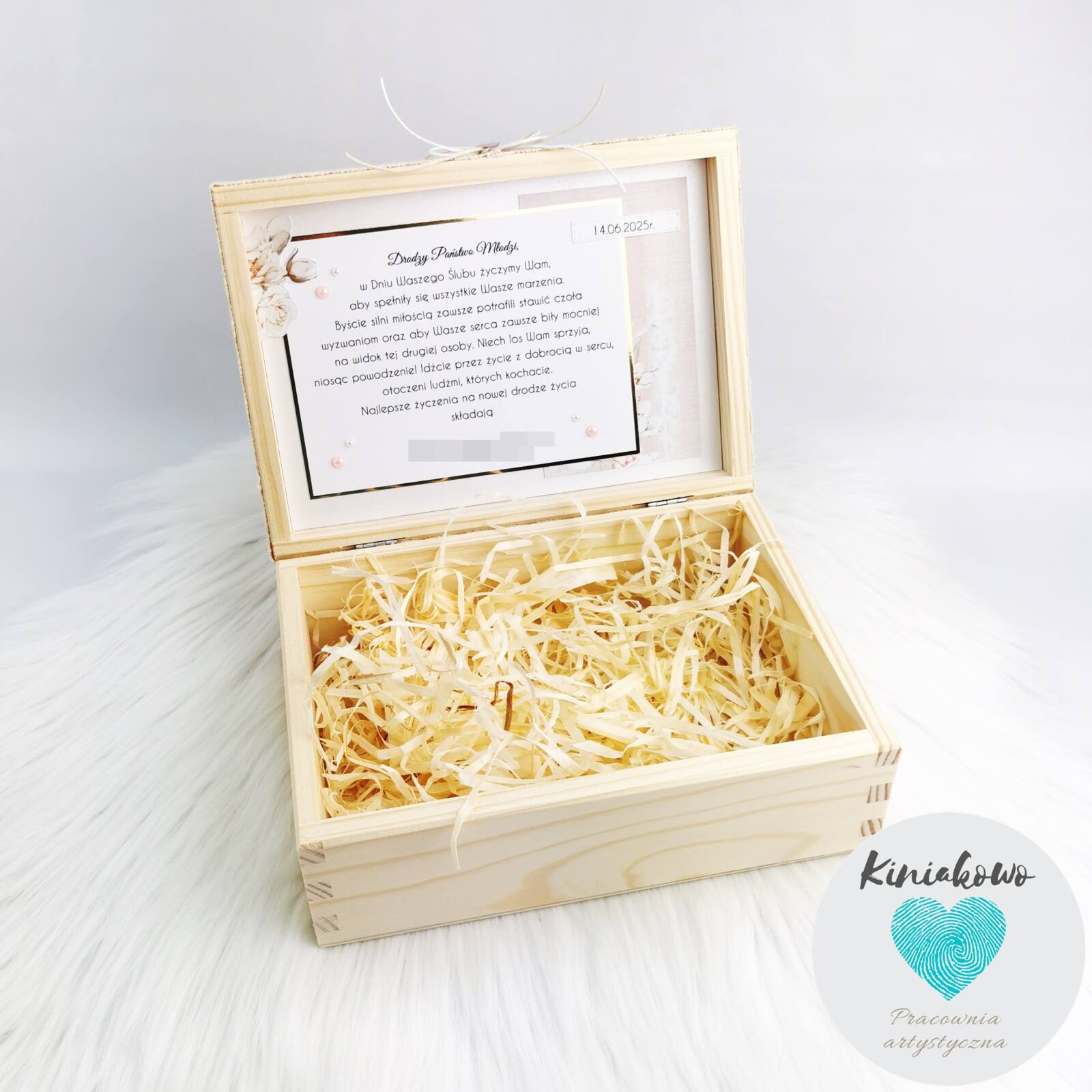 Delikatna makrama, pudrowo-różowe akcenty i ręcznie dobrane dodatki w bieli tworzą kompozycję doskonałą dla najbardziej wymagających gustów. Pudełko ślubne beżowa obietnica to drewniana skrzyneczka, która może wewnątrz posiadać 4 przegrody lub mieć jedną dużą przestrzeń. Wieko pudełka jest pięknie przyozdobione w beżowo białej kolorystyce z dodatkami w odcieniach różu i lustrzanego złota. Na wieku znajdują się wzory kwiatowe, a także wizerunek Nowożeńców. W na środku w prostokątnej ramce są umieszczone imiona Pary Młodej. Pudełko jako prezent ślubny może zawierać wewnątrz 4 przegrody, między innymi na zdrówko – przeznaczone na alkohol, na rozmnożenie – miejsce na pieniądze, na osłodę – miejsce na niewielki słodycz, na przyszłość – miejsce na smoczek czy skarpetki dziecięce, na szczęście – tu można włożyć kupon totolotka albo grosze. We wnętrzu spersonalizowanego pudełka znajdują się personalizowane życzenia dla Młodej Pary.