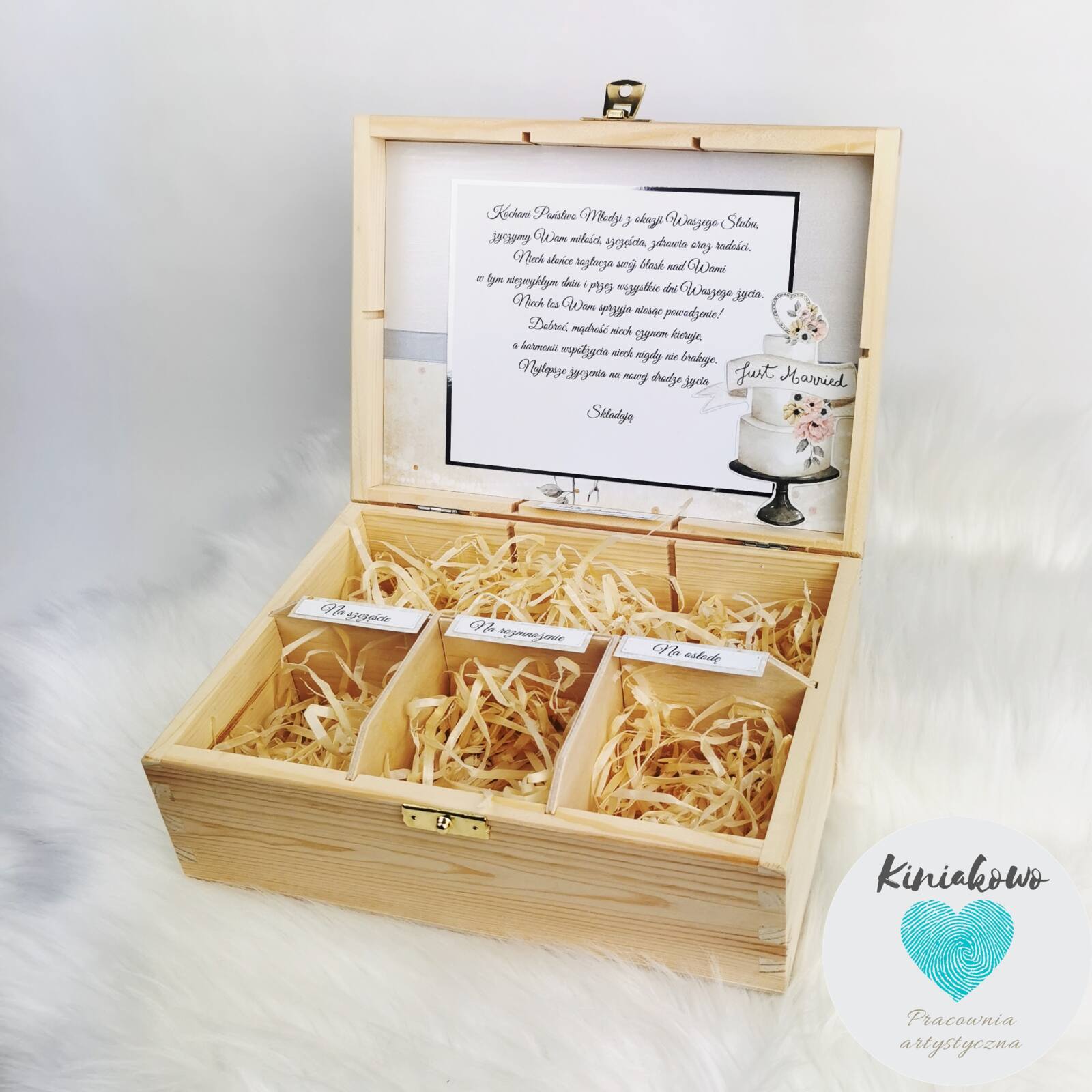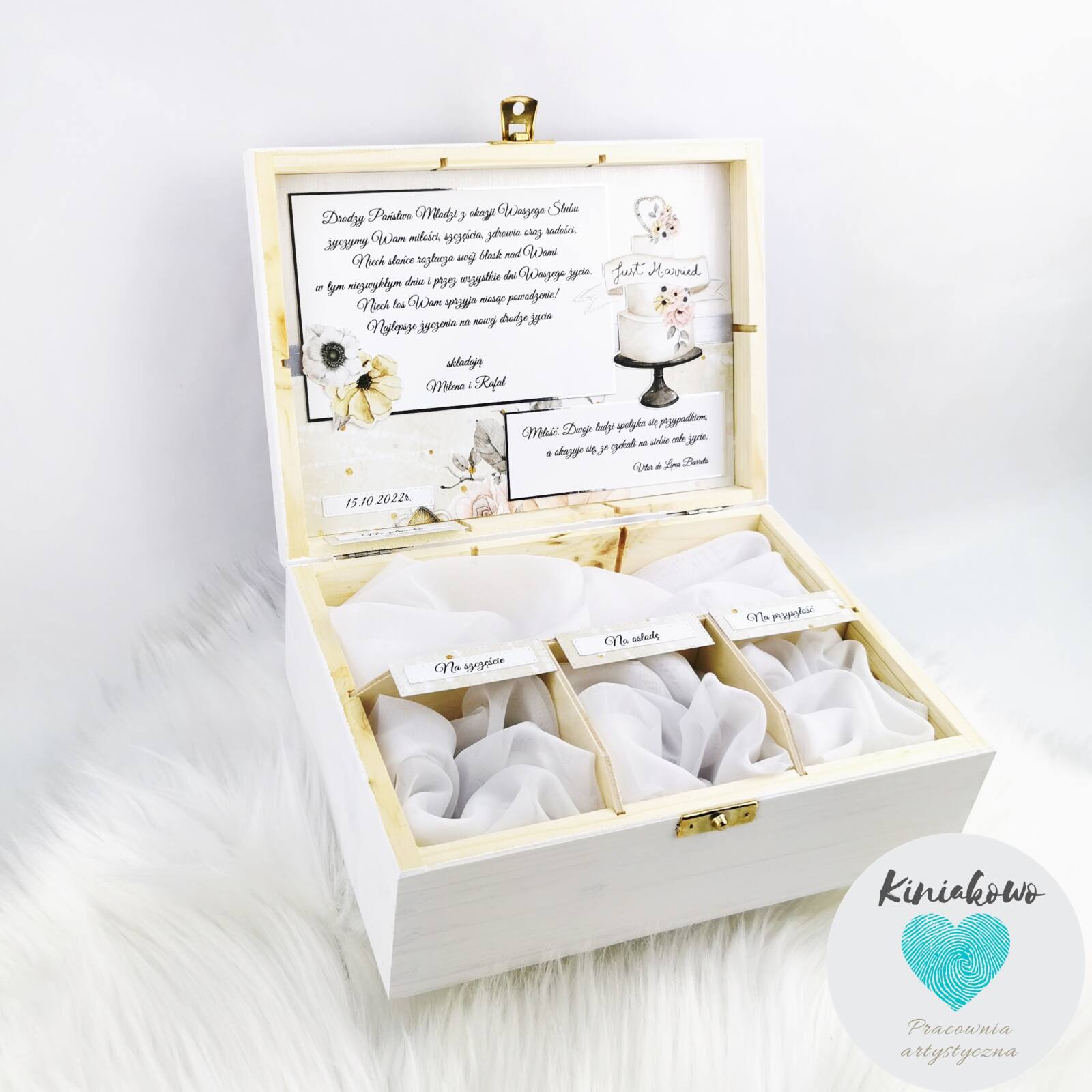 Imiona Pary Młodej na wieczku pudełka mogą być wydrukowane na białym papierze bądź wykonane ze sklejki i pomalowane. Przegrody wewnątrz pudełka z okazji ślubu ona i on mogą być wypełnione flizeliną, wełną drzewną lub woalem w kolorze białym.