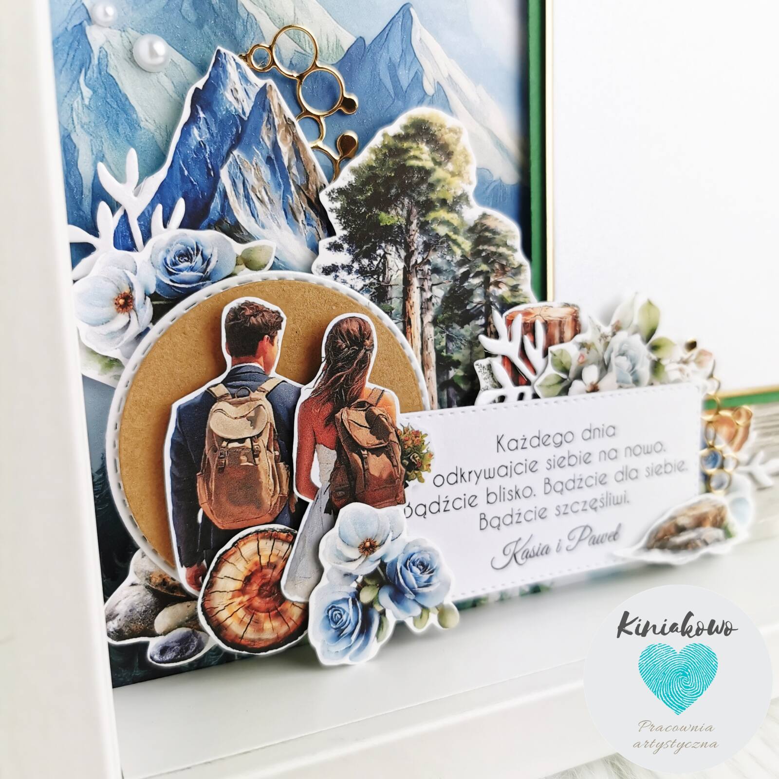 Oryginalny prezent ślubny – ręcznie robiona ramka na górskim szlaku. Personalizacja z imionami i zdjęciem sprawia, że to wyjątkowa pamiątka.