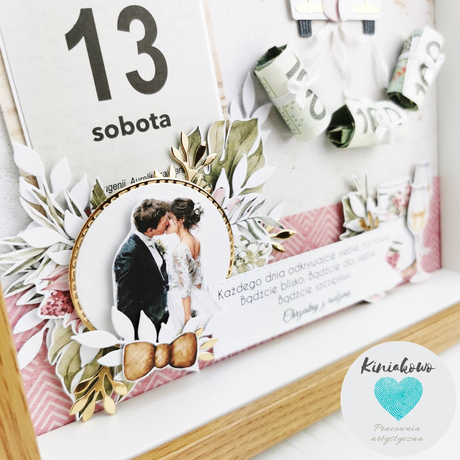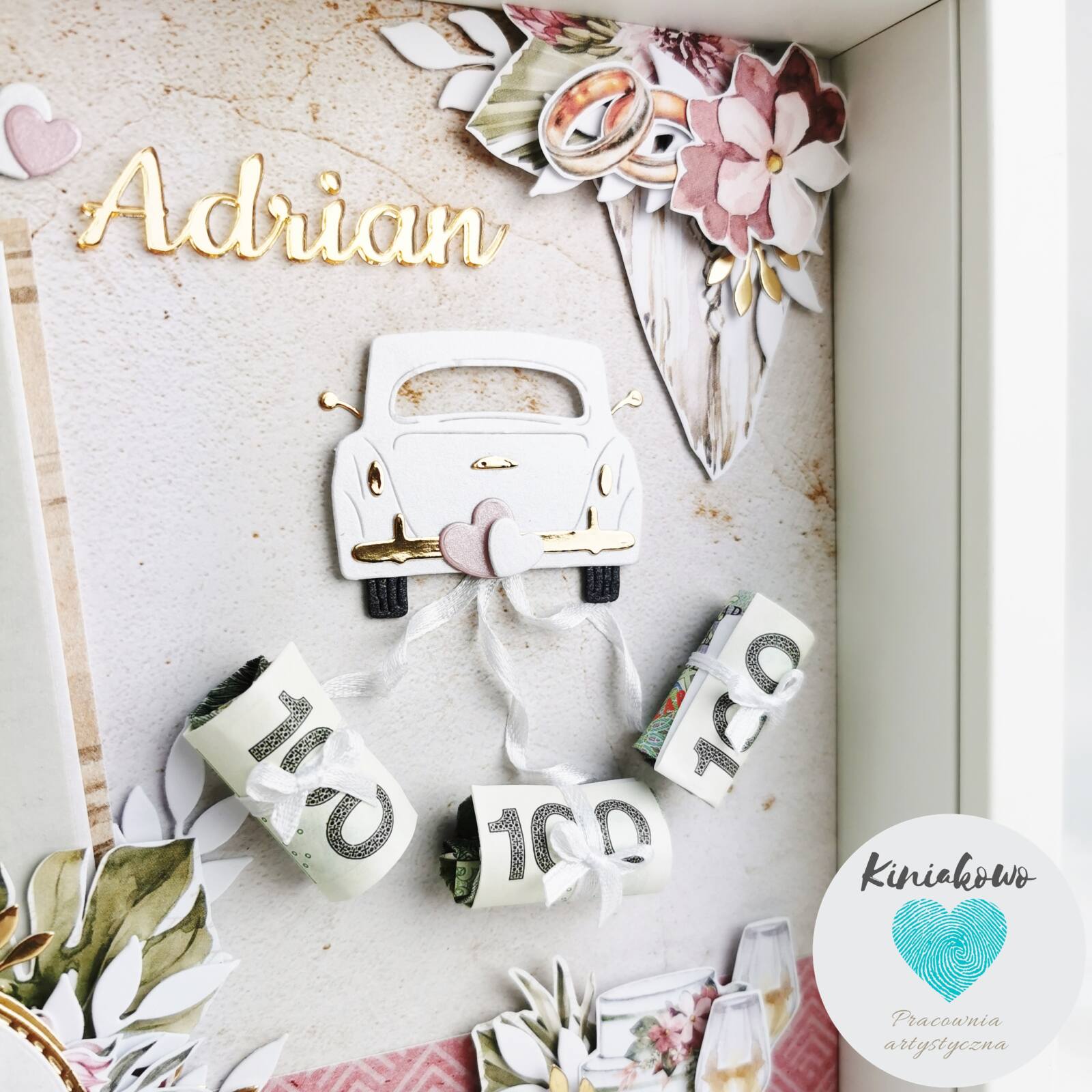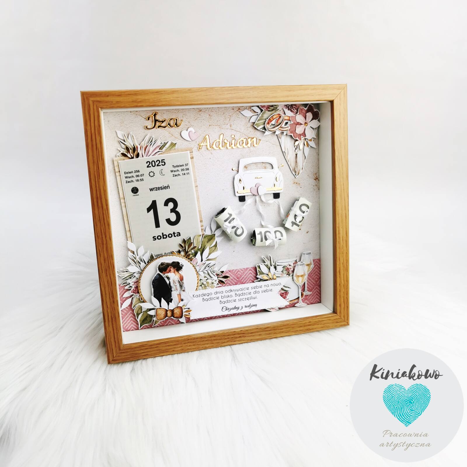 W ramce znajdują się symboliczne i eleganckie elementy: samochodzik z puszkami wykonanymi z banknotów – symbol wspólnej podróży małżeńskiej, grafika Pary Młodej, tort weselny i lampki szampana, dekoracje w stylu boho – liście monstery, różowe kwiaty oraz piękna makrama. Spersonalizowany prezent z okazji ślubu może zawierać od 3 do 4 wstążeczek na pieniądze.
