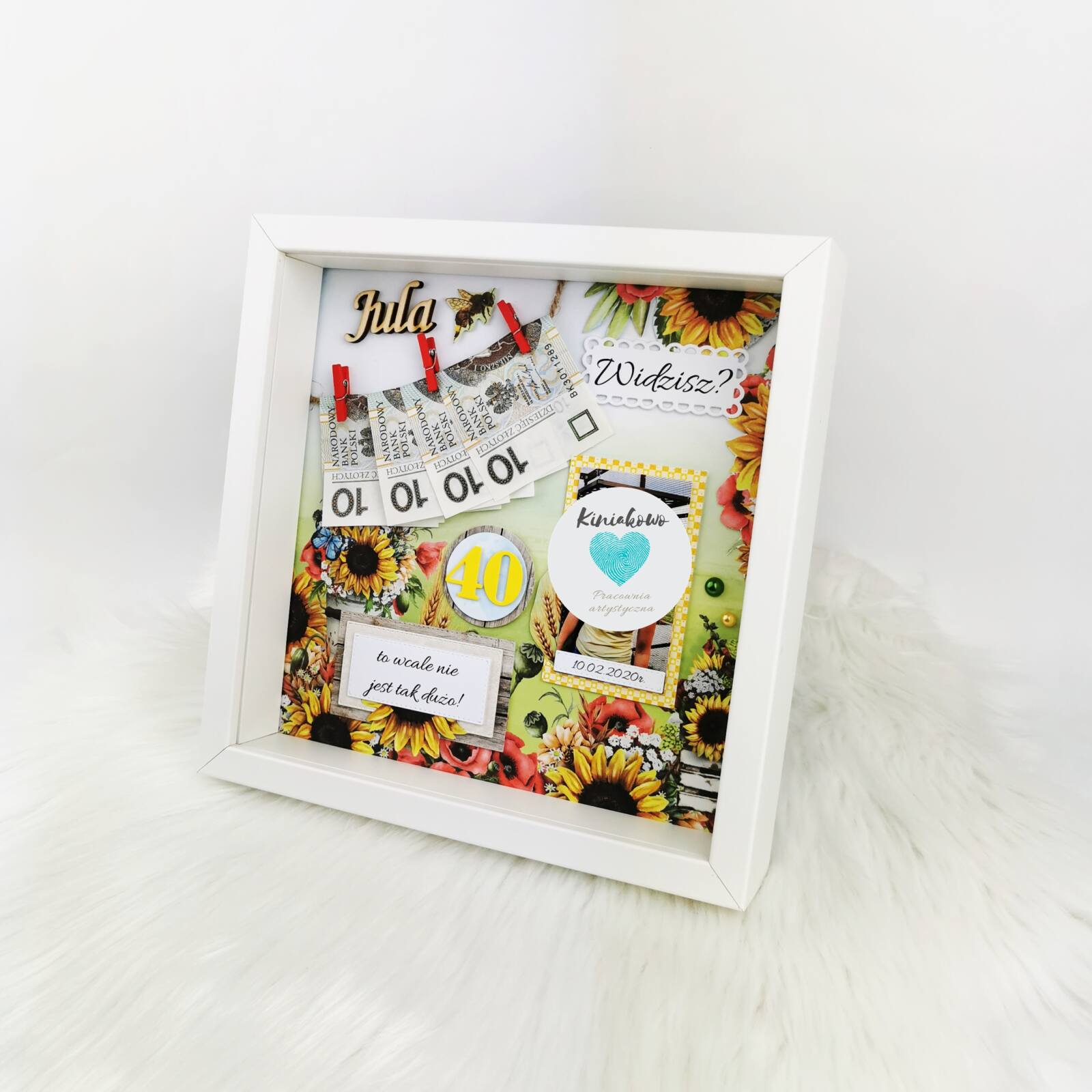 Spersonalizowana ręczne wykonana ramka przestrzenna została stworzona z myślą o miłośnikach słoneczników. Ramka urodzinowa to doskonały oraz unikatowy prezent z okazji urodzin, który z pewnością wprawi w zachwyt Jubilata. Tego rodzaju prezent zostanie zapamiętany i będzie piękną pamiątką. Taki rodzaj ramki urodzinowej przypadnie do gustu dla osób, które uwielbiają sielankowe klimaty oraz słoneczniki. Tworzone w naszej pracowni artystycznej ramki urodzinowe są niepowtarzalne, ponieważ to produkt typu handmade.