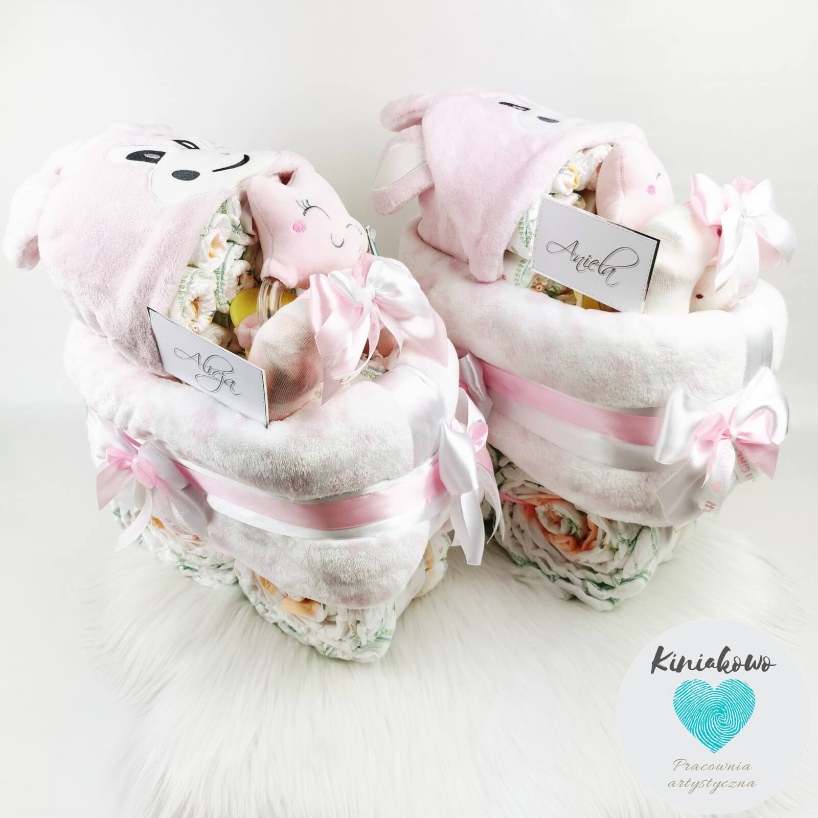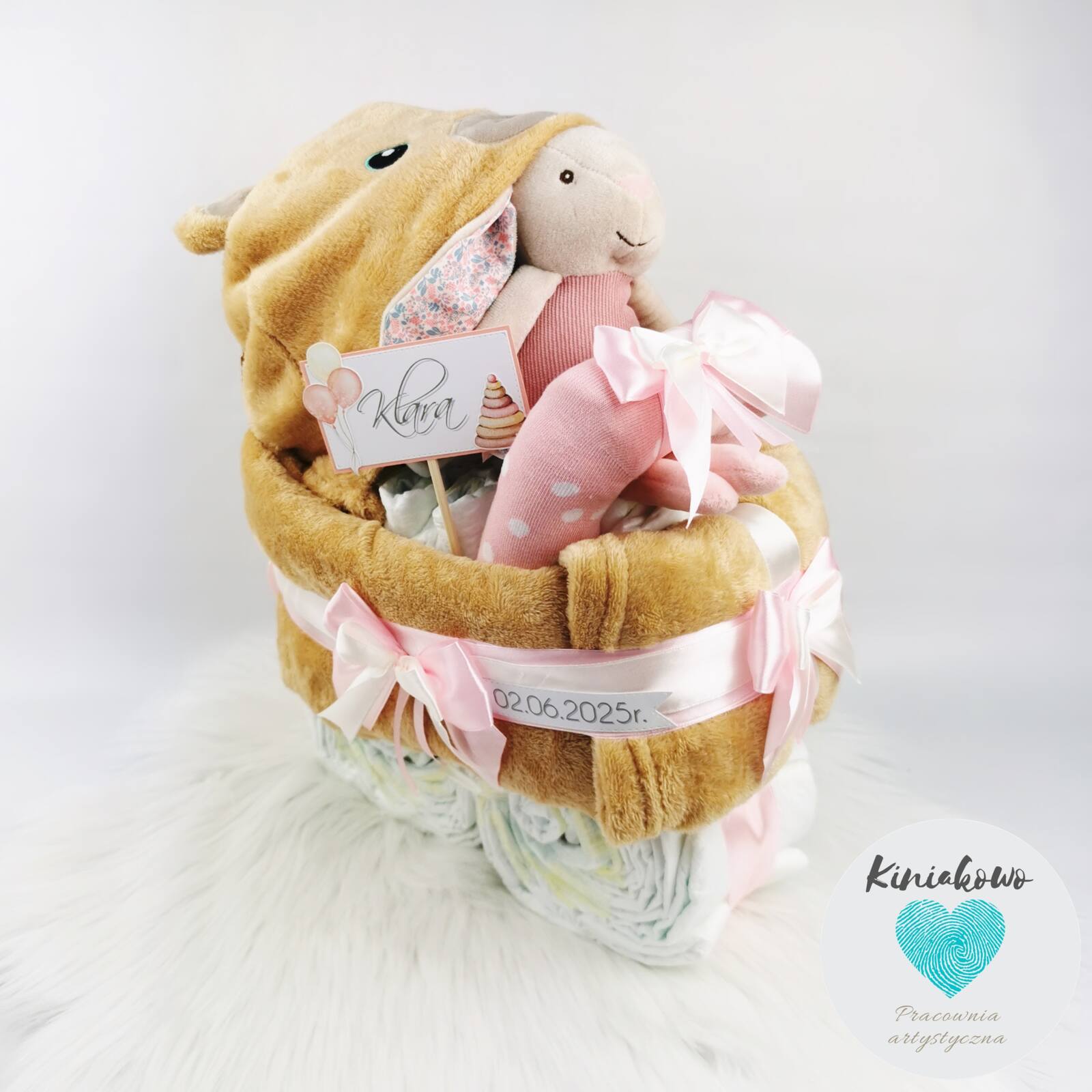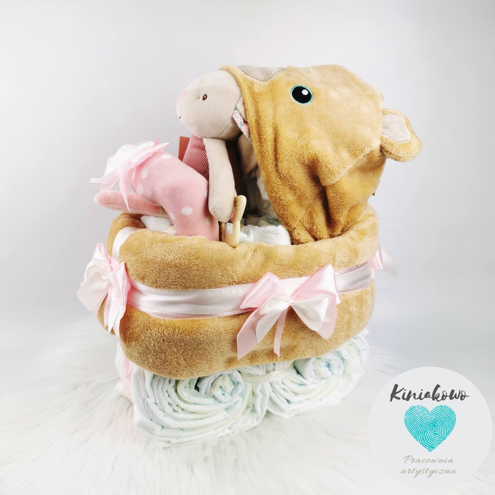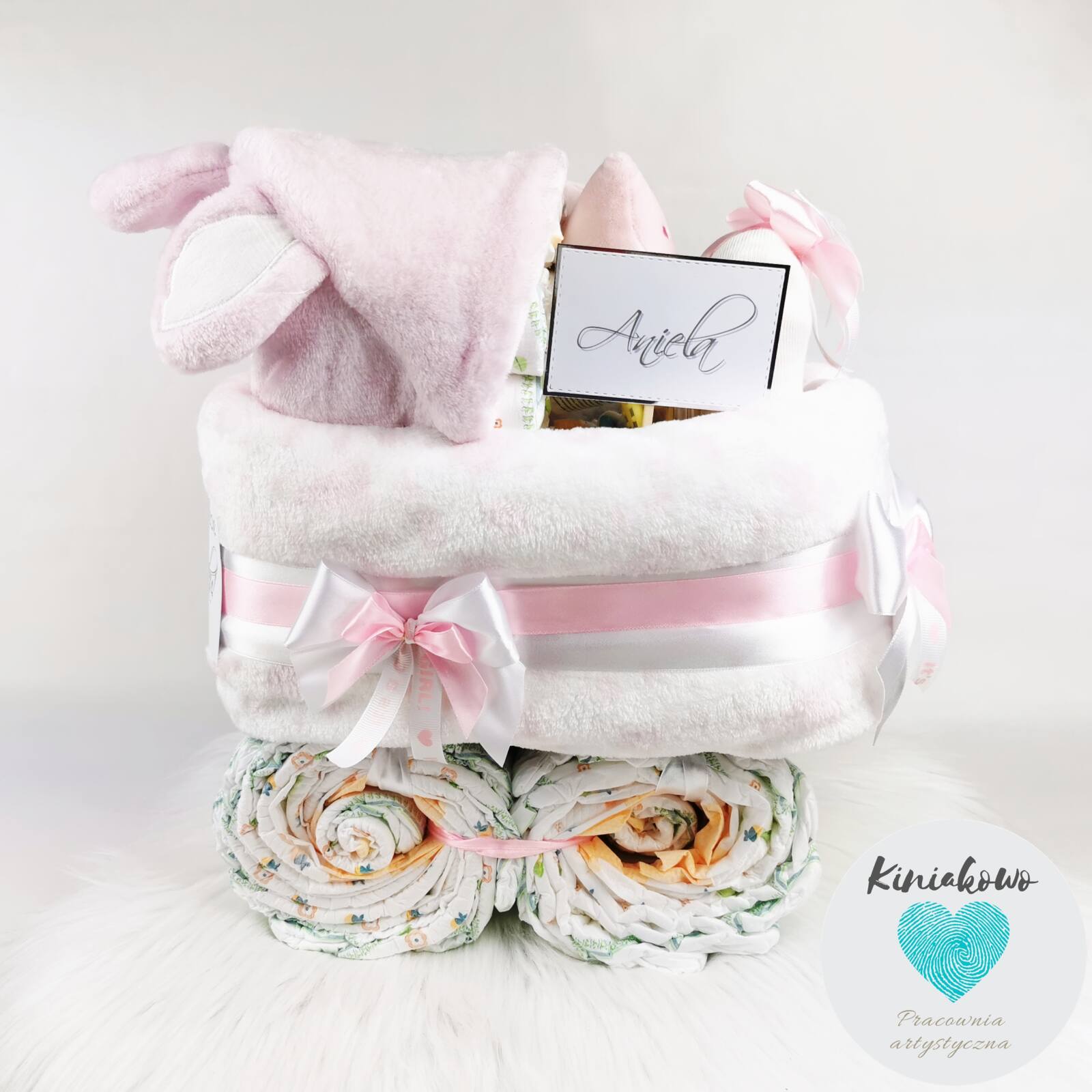 Wózeczek z pampersów dla dziewczynki jest produktem ręcznie wykonywanym. Wózek może zostać wykonany z pieluszek marki Pampers albo Dada. Do wyboru jest także rozmiar pampersów oraz kolorystyka kocyka, do którego są dobierane dodatki oraz dekoracje. W skład wózeczka z pampersów wchodzi mięciutki kocyk z kapturkiem, od 60 do 70 sztuk pieluszek (w zależności od rozmiaru), zabawka dopasowana kolorystycznie do kocyka oraz skarpetki. Możemy umieścić na nim dowolny napis, datę narodzin albo imię dziecka. Cały wózeczek jest zapakowany w celofan i zawiązany ozdobną wstążką. Elementy składowe wózeczka są tak ze sobą połączone, że można jest wykorzystać.