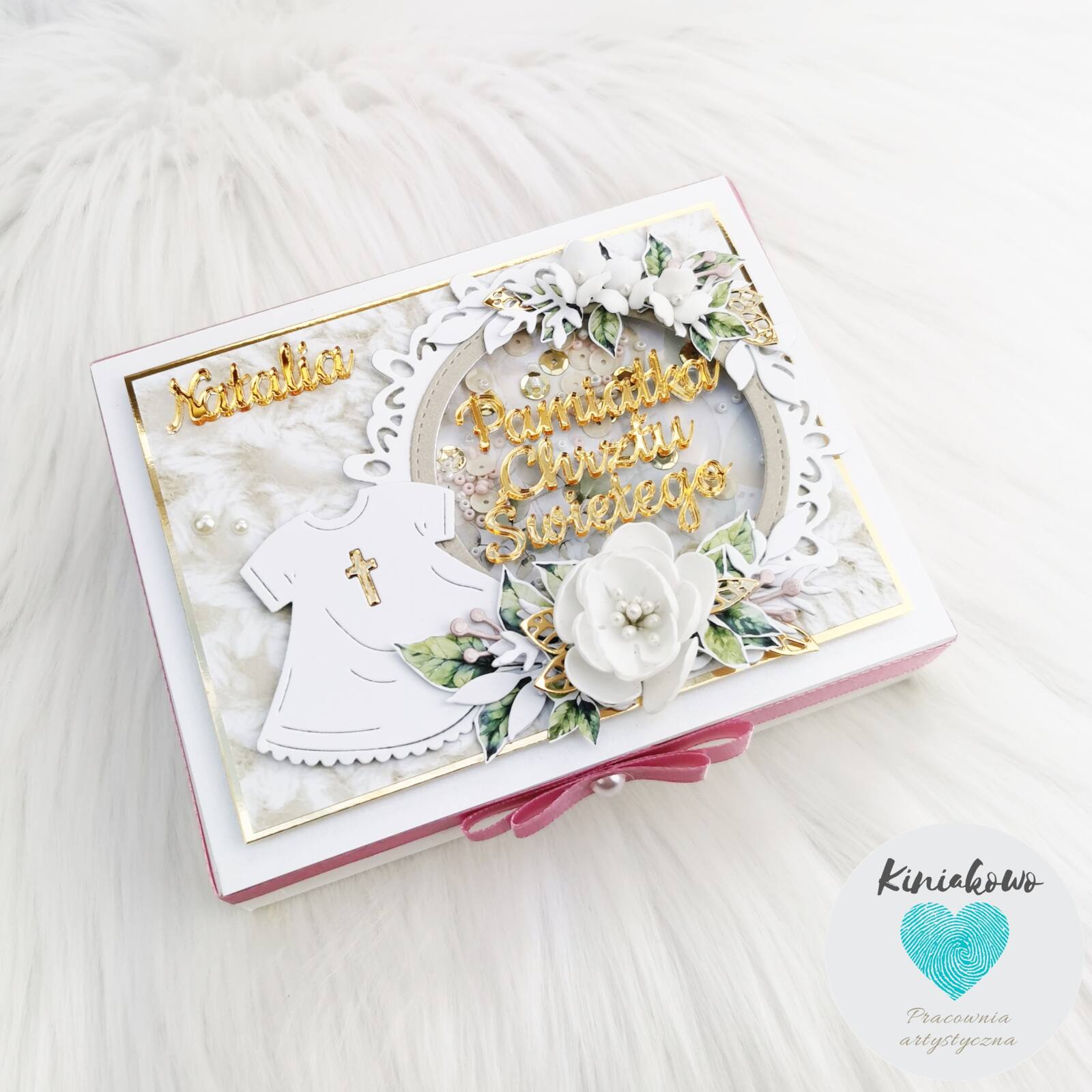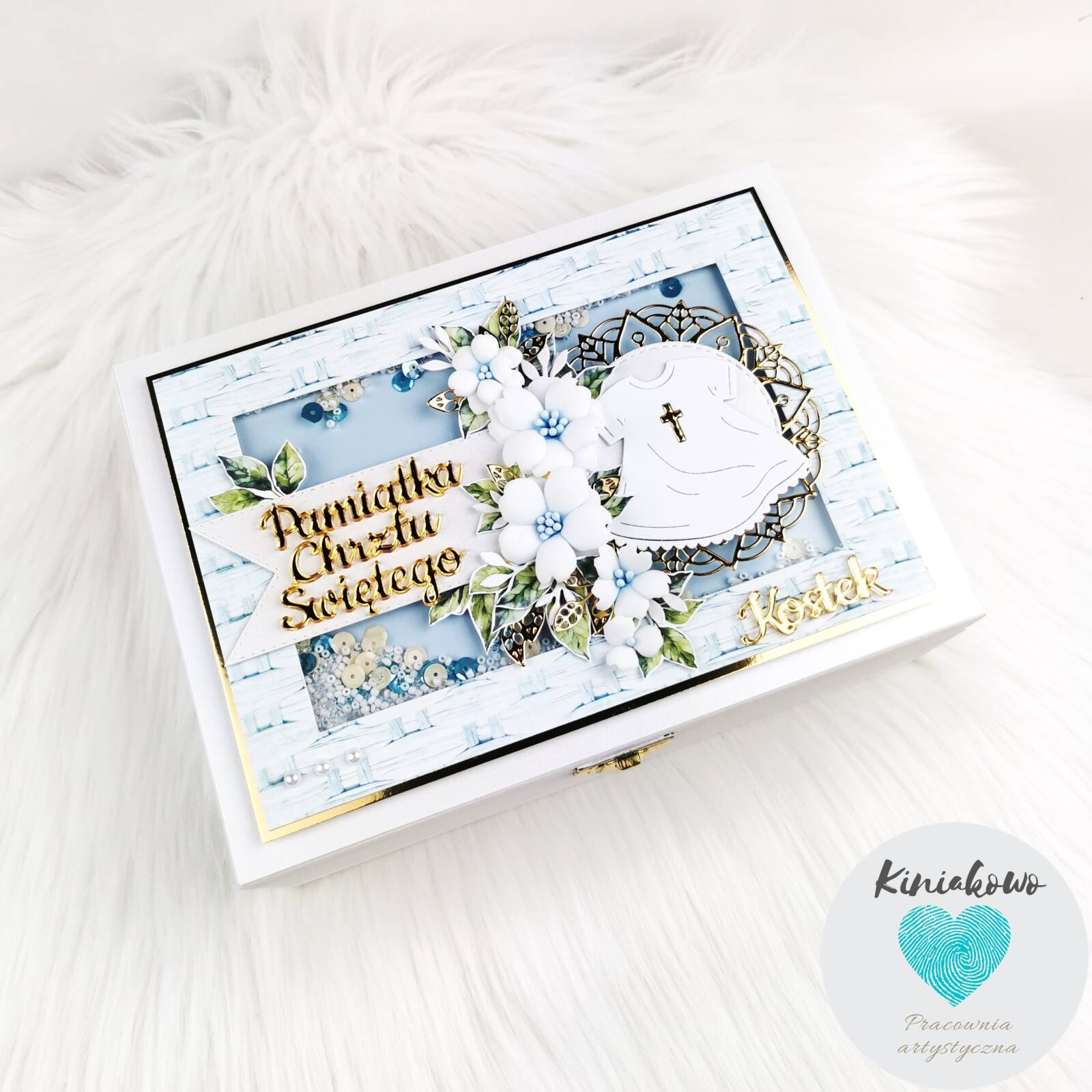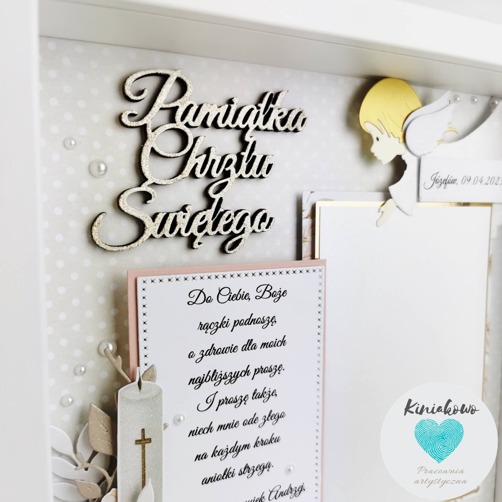 Pudełko jest idealnym pomysłem na prezent dla małego dziecka na Chrzest Święty. Ręcznie wykonane pudełko wprawi w zachwyt nie tylko rodziców i maluszka, ale także będzie niepowtarzalną pamiątką, przywołującą wiele wzruszeń oraz pozytywnych emocji, związanych z przyjęciem sakramentu Chrztu Świętego. Pudełko dla dziecka to doskonała alternatywa dla typowej kartki, gdyż w jego wnętrzu kryją się życzenia, a w przegrodach można umieścić pieniądze, biżuterię bądź drobny upominek.