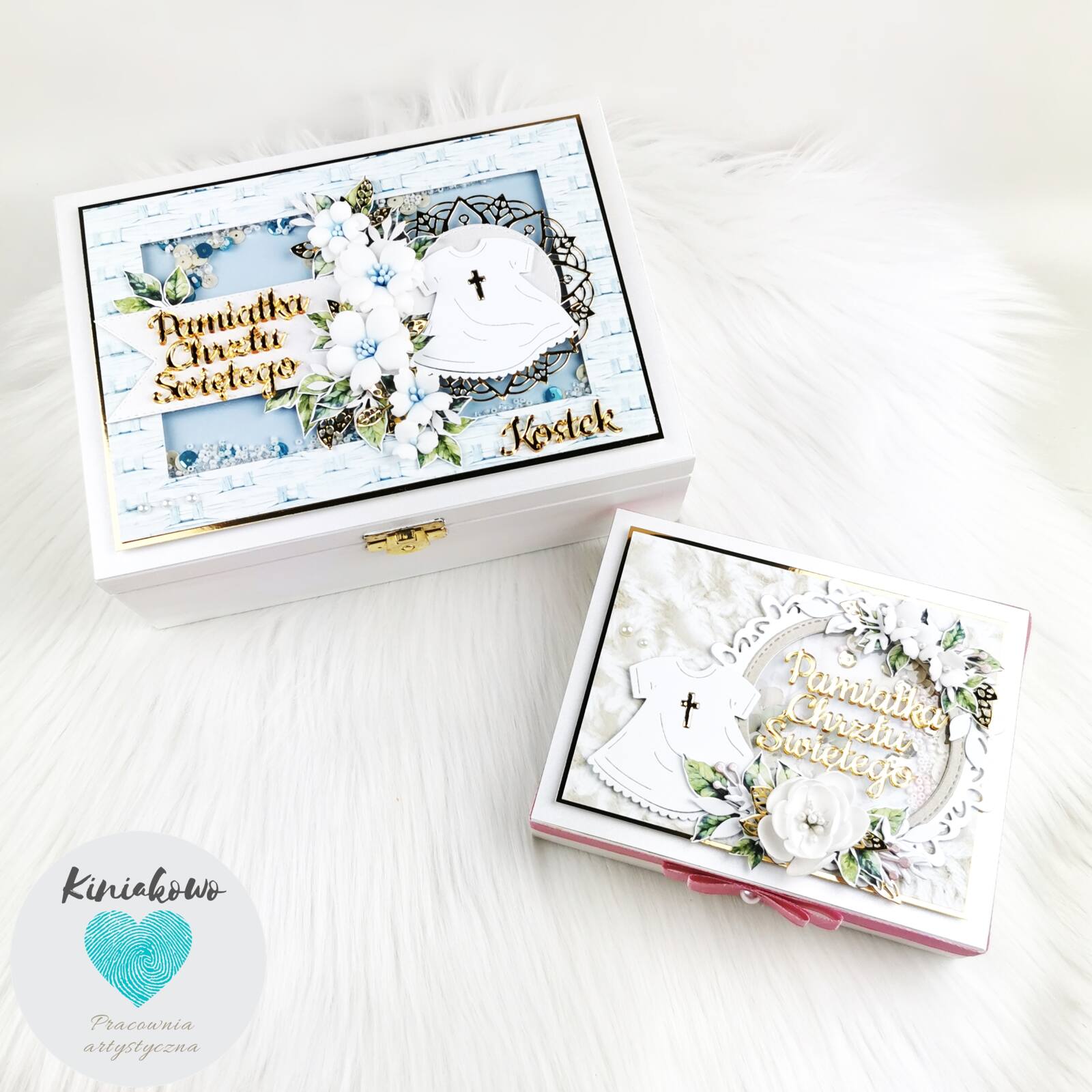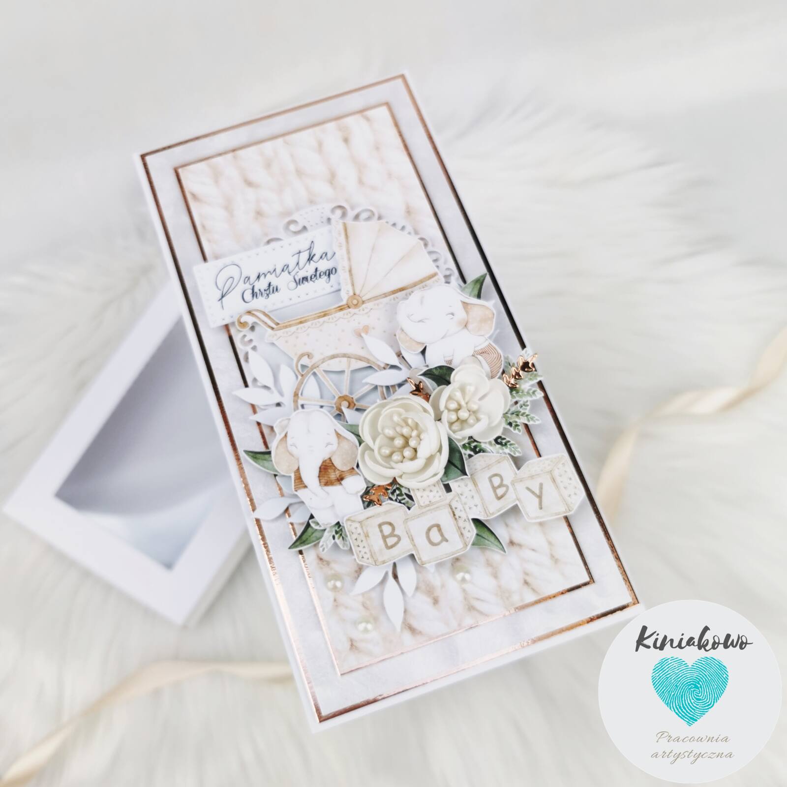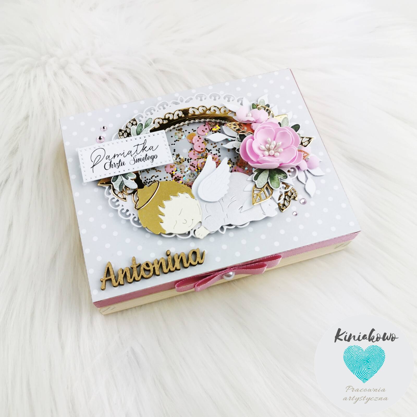 Pudełko jest idealnym pomysłem na prezent dla małego dziecka na Chrzest Święty. Ręcznie wykonane pudełko wprawi w zachwyt nie tylko rodziców i maluszka, ale także będzie niepowtarzalną pamiątką, przywołującą wiele wzruszeń oraz pozytywnych emocji, związanych z przyjęciem sakramentu Chrztu Świętego. Pudełko dla dziecka to doskonała alternatywa dla typowej kartki, gdyż w jego wnętrzu kryją się życzenia, a w przegrodach można umieścić pieniądze, biżuterię bądź drobny upominek.