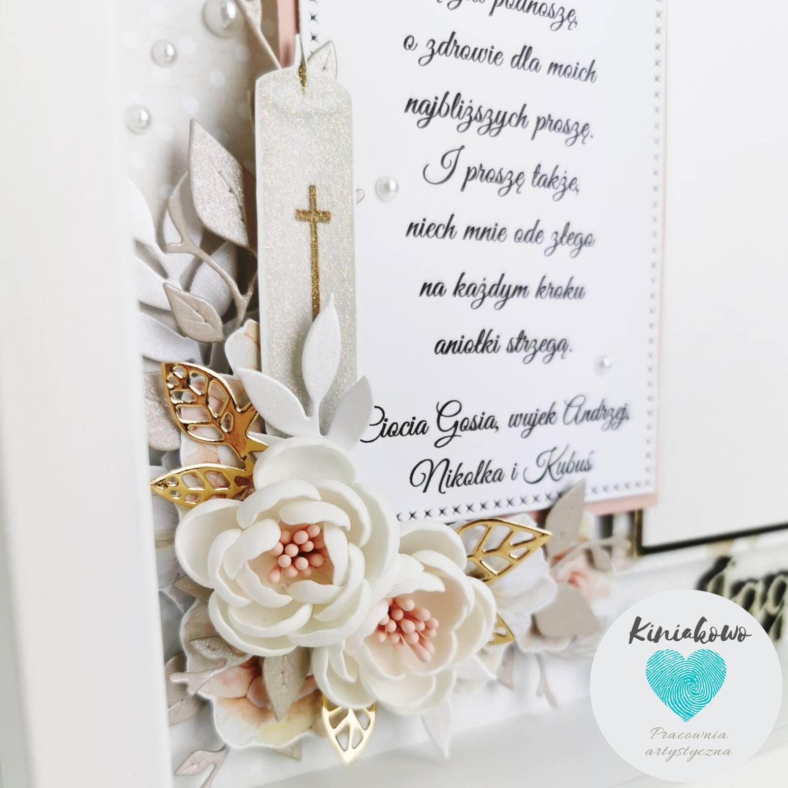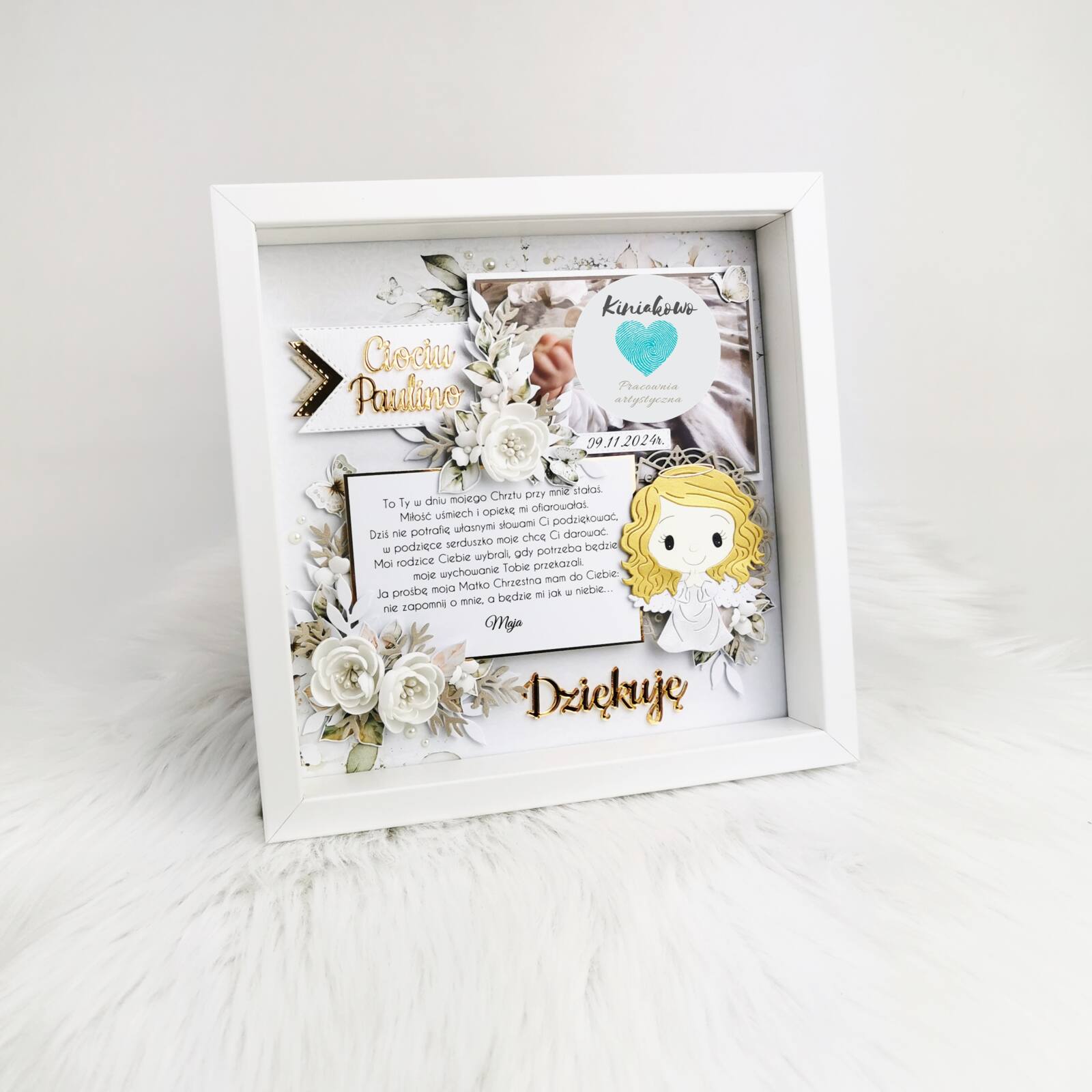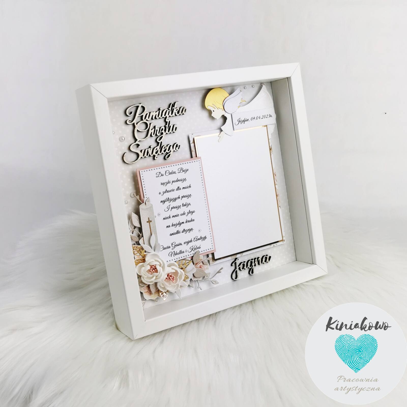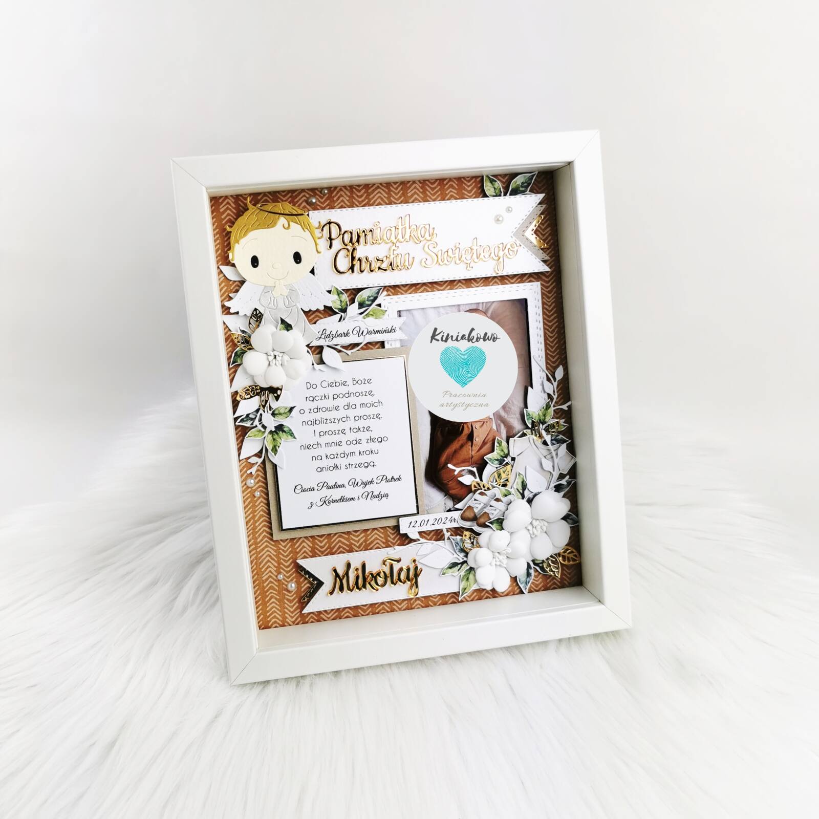 Upominek cieszący się największą popularnością w kategorii prezentów na Chrzest to ręcznie tworzone ramki z życzeniami. Są to bardzo gustowne i ponadczasowe pamiątki Chrztu Świętego dziecka, które doskonale oddają rangę tej wyjątkowej uroczystości. Wyróżniają się pięknym wzornictwem, estetycznością oraz starannością wykonania. W naszych ramkach przestrzennych z osobistymi życzeniami i imieniem dziecka umiejętnie została połączona uniwersalność z niespotykaną stylistyką. Pamiątki Chrztu Świętego są pięknie zdobione, urzekają swoim wdziękiem, zachwycają stylem, a ich niepodważalna zaleta to personalizacja, a także możliwość dopasowania projektu do Twoich oczekiwań. W ramce może pojawić się miejsce na zdjęcie z uroczystości. Dodatkowo wspaniale pasują do każdego wnętrza – można je postawić na półce lub komodzie albo zawiesić w pokoju dziecka na ścianie.